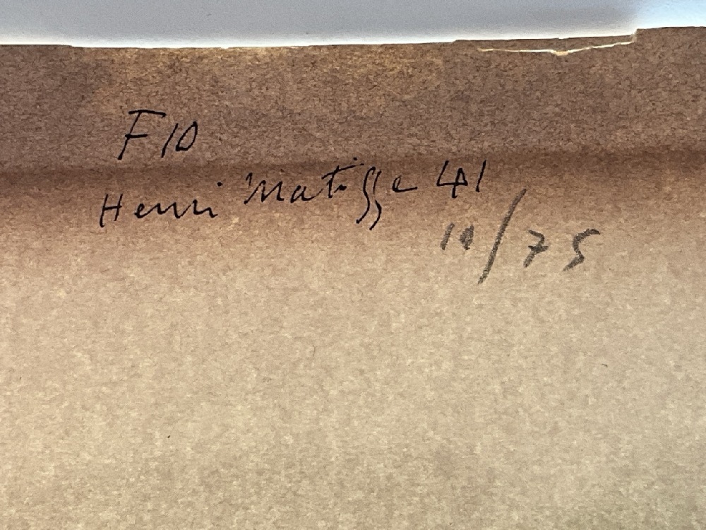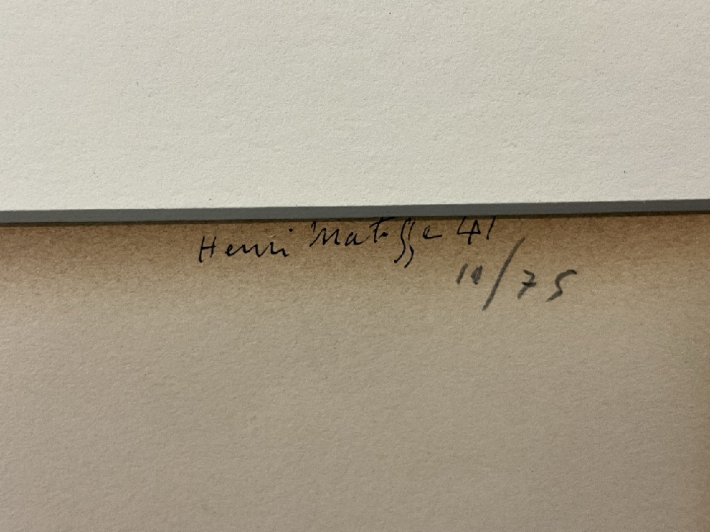 Henri Matisse Hand Signed F10 Print Dated 1941. Signed in pencil lower right and signed in ink upper right and dated 1941. Additionally marked in pencil 10/75.