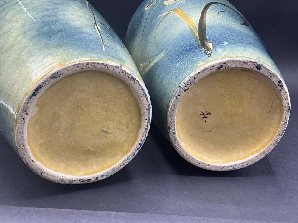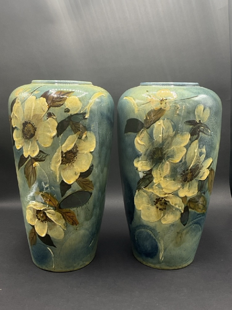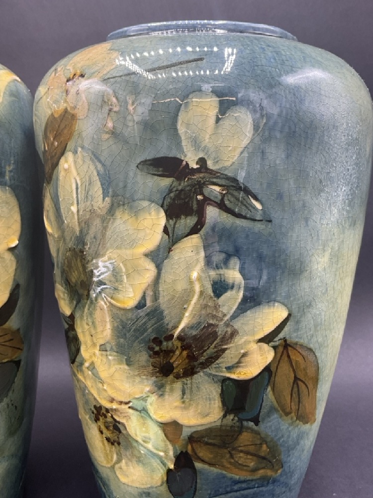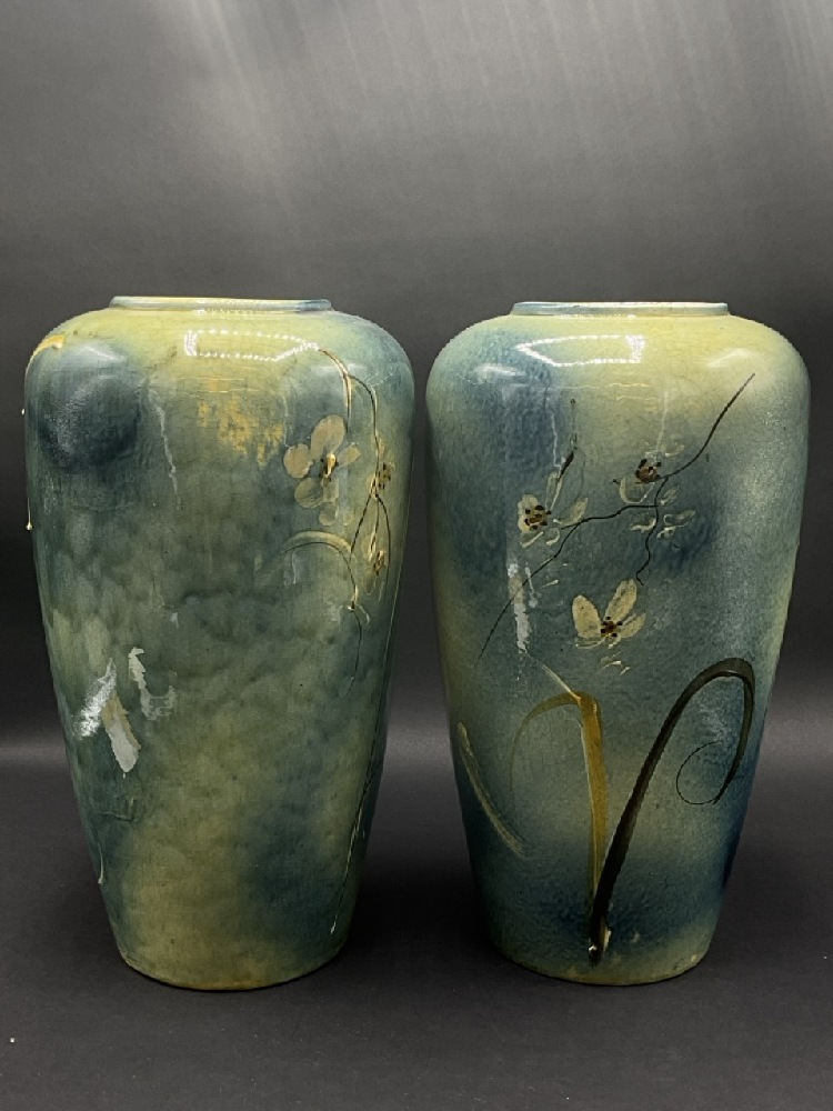 A Pair, Weller or Early American Art Pottery 13" Vases. Sunflowers with glaze.