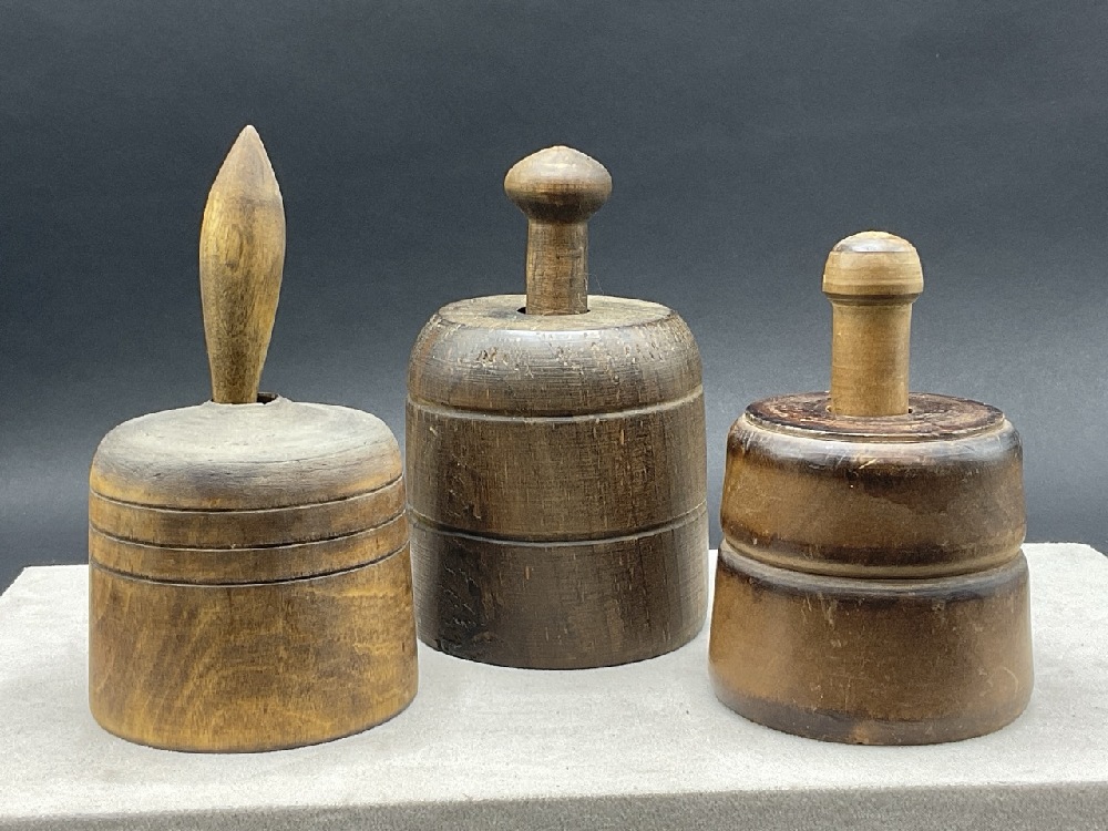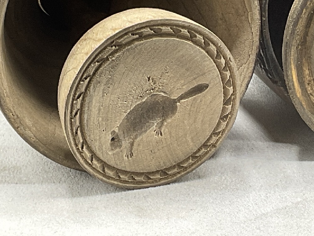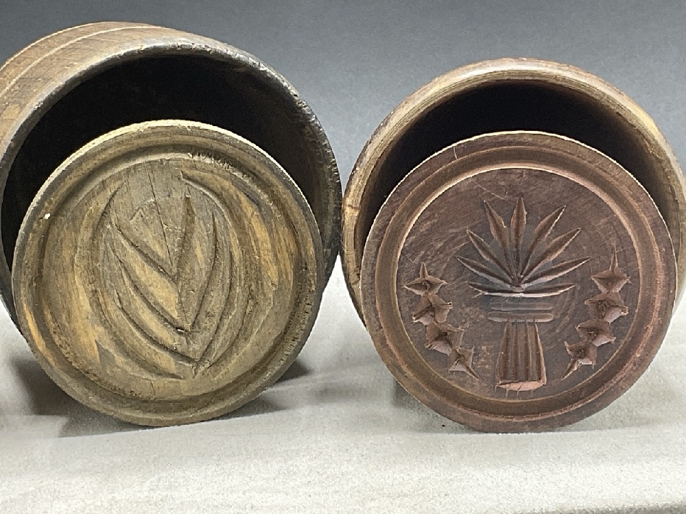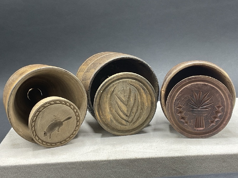 Three (3) Antique Butter Stamps. One with Beaver and Wheat Patterns