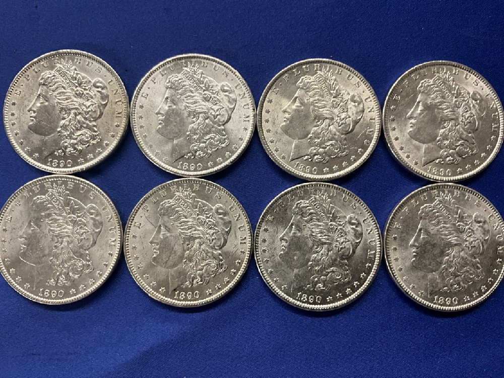 (8) Uncirculated 1890-P Morgan Silver Dollars. Estate Hoard Find of Uncirculated Morgan Silver Dollars.
