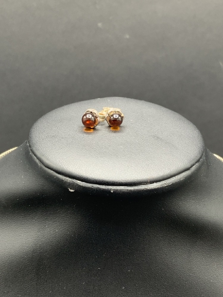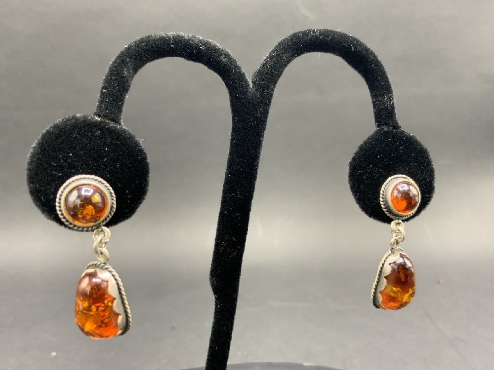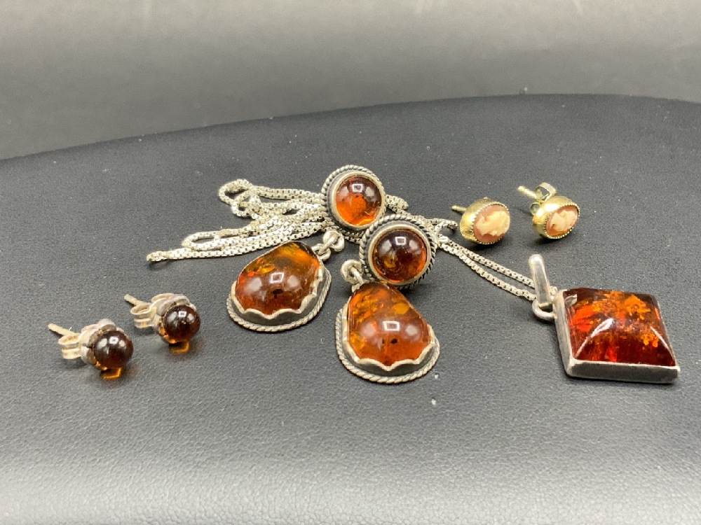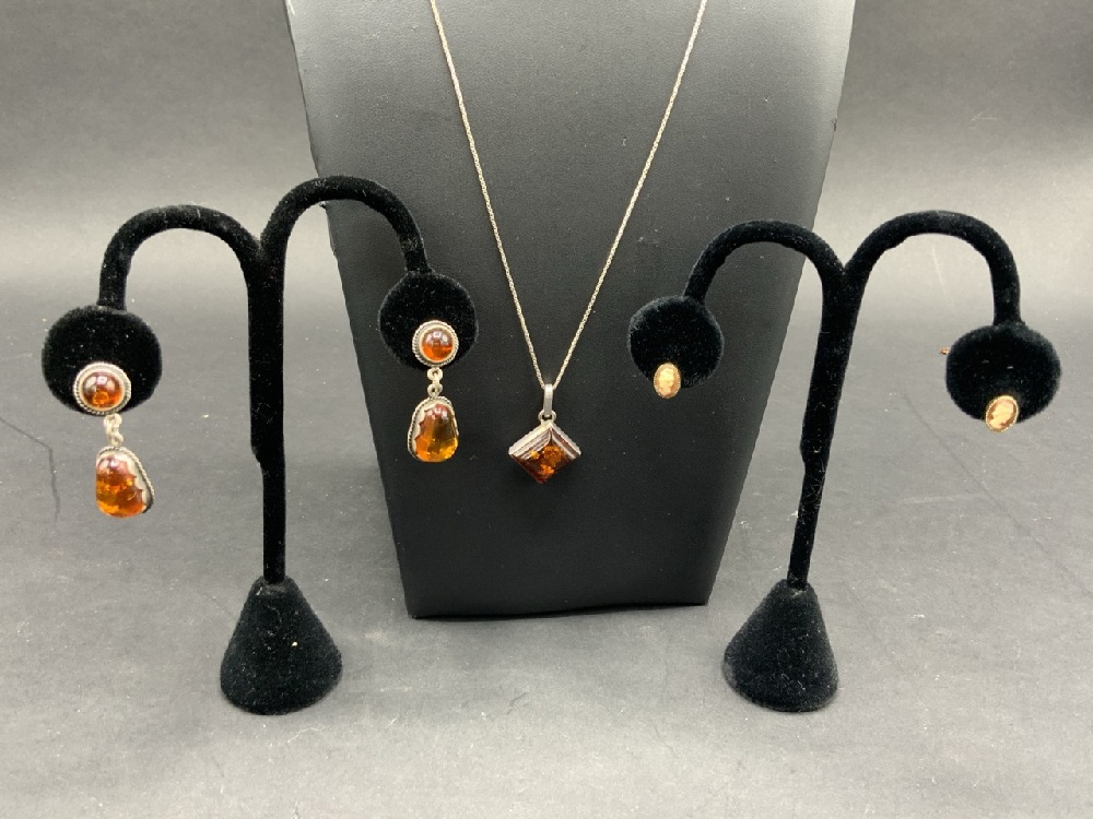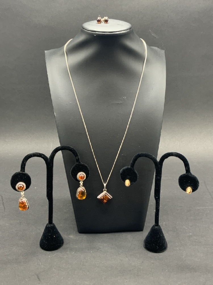 Sterling Silver Amber Jewelry Group. Necklace, Earrings.