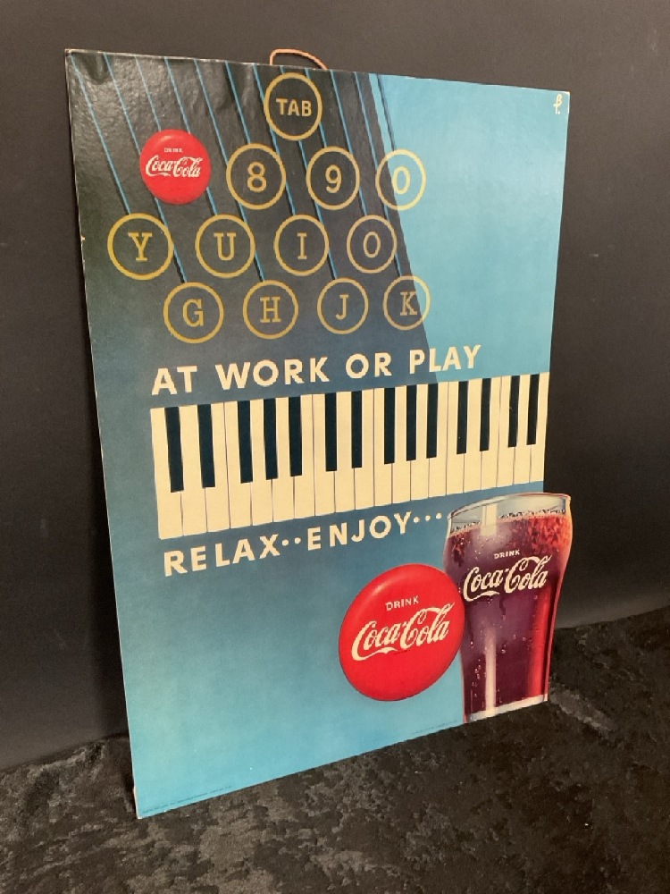 Vintage Cardboard Countertop Coca Cola Advertisement with Keyboard and Piano Keys. "At Work or Play, Relax- Enjoy"