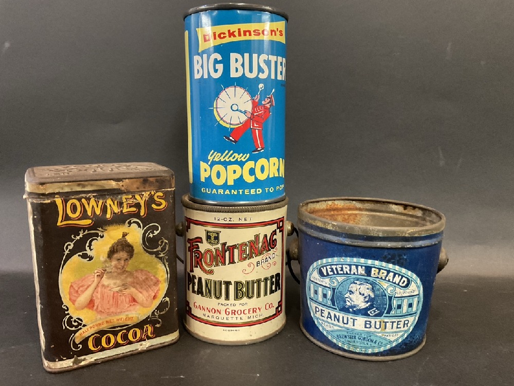 Four (4) Vintage Snack Tins - Frontenag & Veteran Brand Peanut Butter, Dickinson’s Popcorn, Lowney’s Cocoa.
