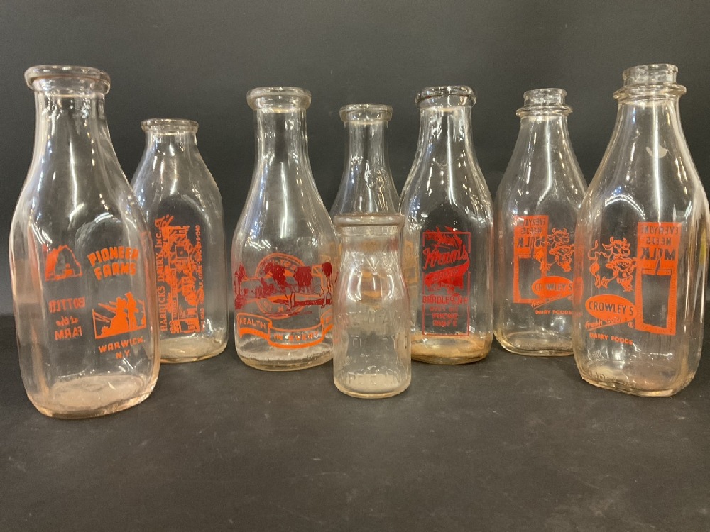 Eight (8) Local Milk Bottles - Pioneer Farms, Warwick, NY Krum’s Dairy, Bradley, NY, Harrick’s Dairy Inc, Norwalk, Conn, Monson Milk Co, Mass, Crowleys.