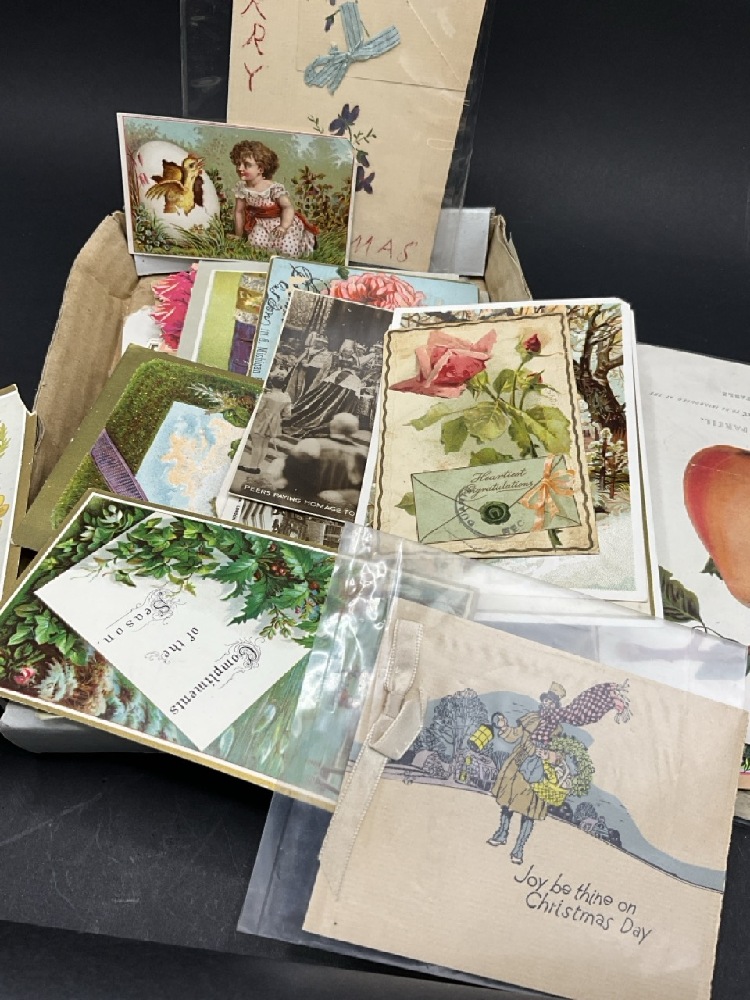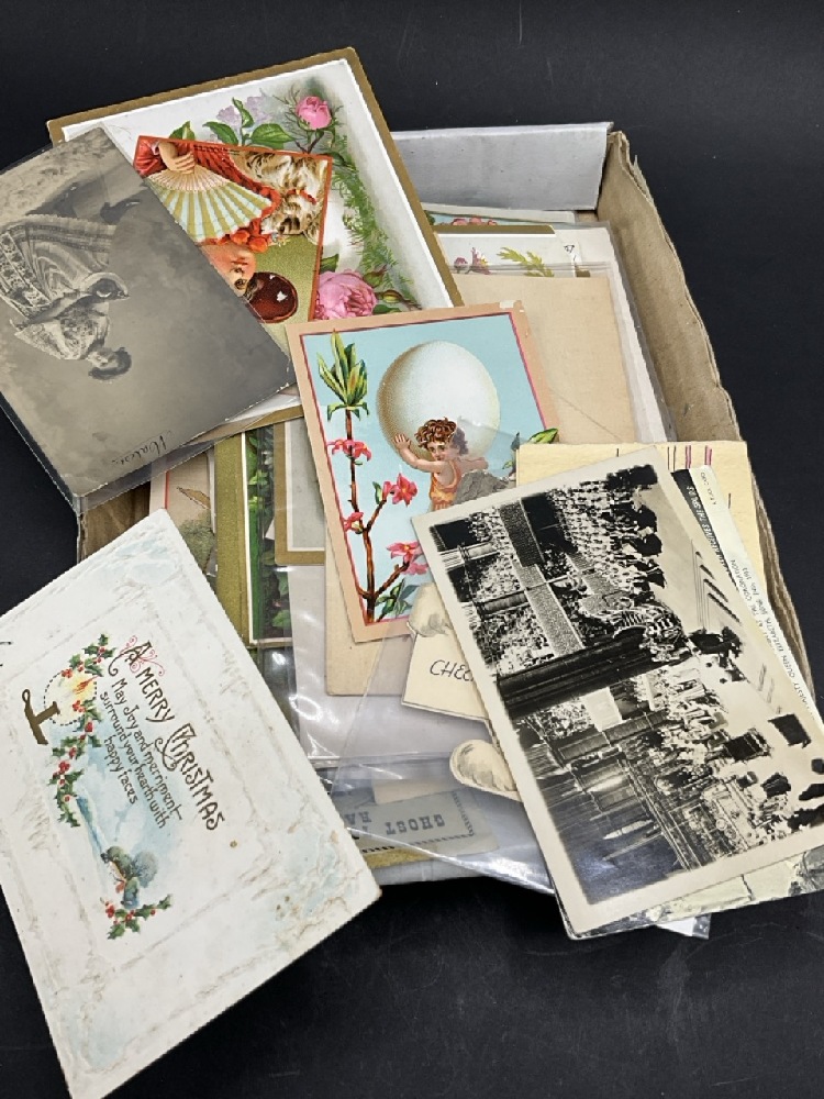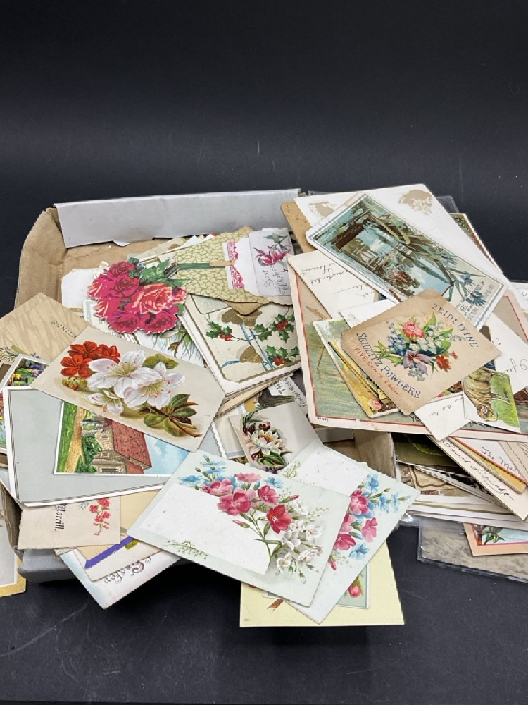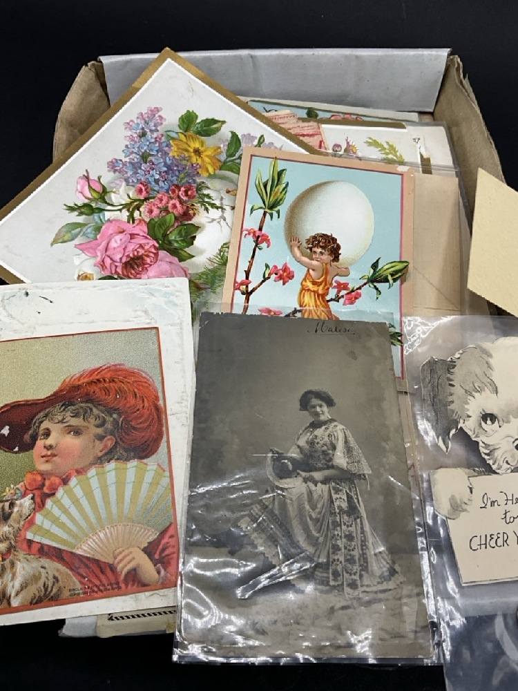 Estate Compiled Box of Paper Ephemera. Postcards, Trade Cards, Advertisements Etc.