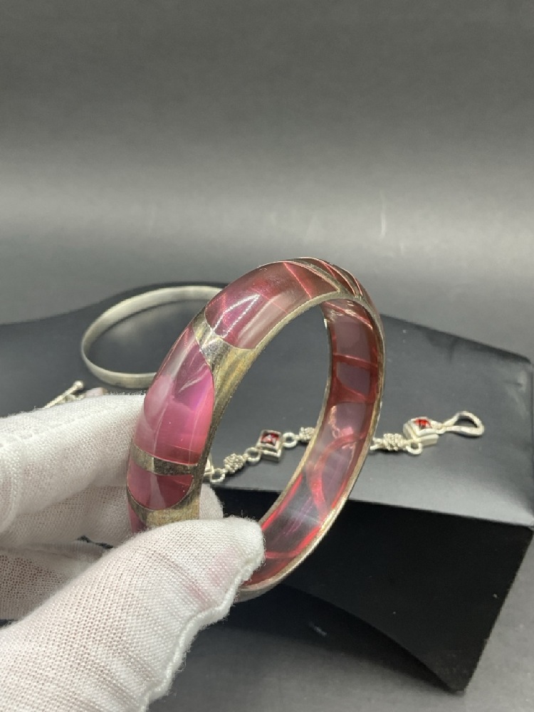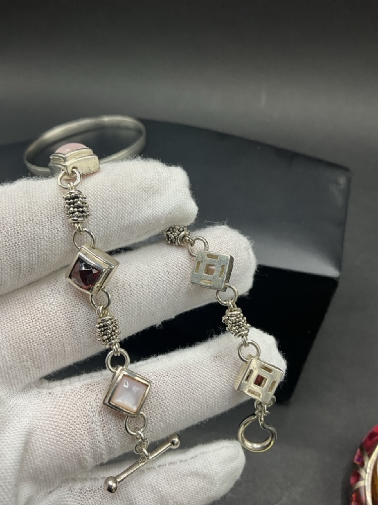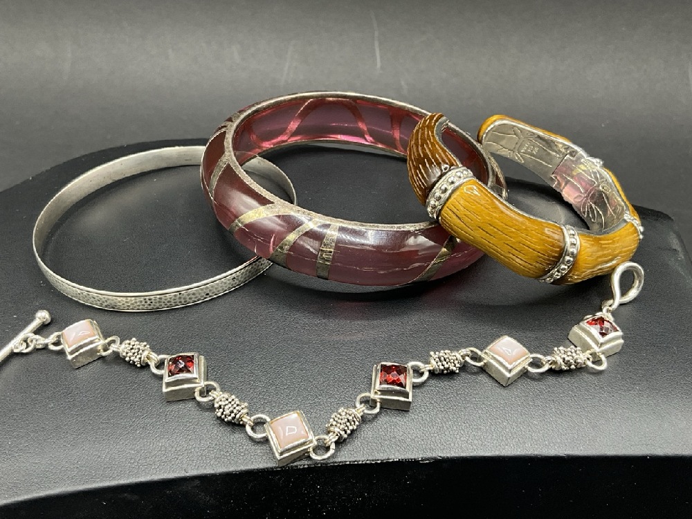 Four (4) Bracelets. Sterling Silver overlay, cat's eye, Michael Dawkins and sterling bangle.