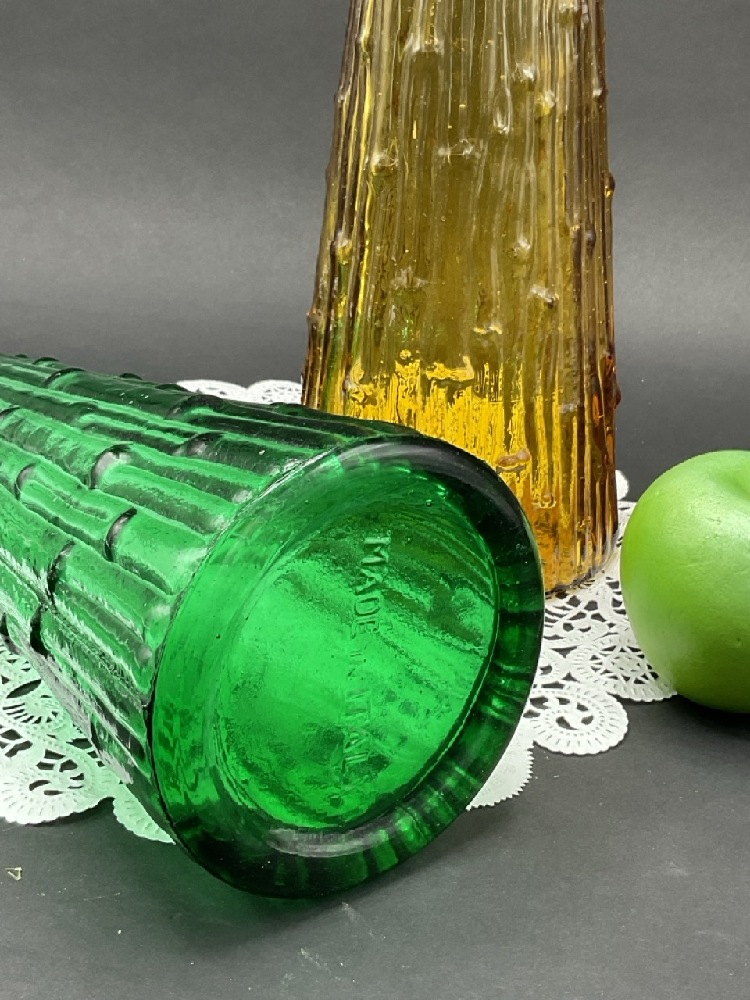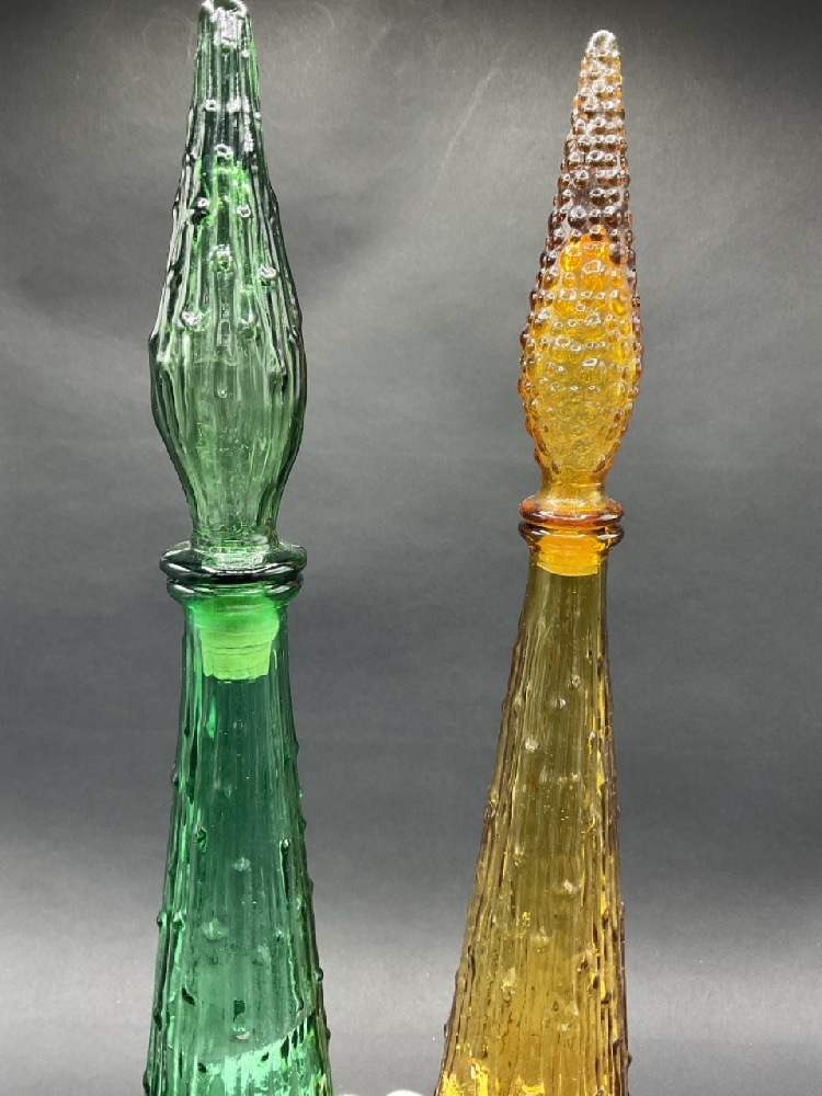 Two Bamboo Form Glass Genie Bottles by Empoli. Made in Italy.