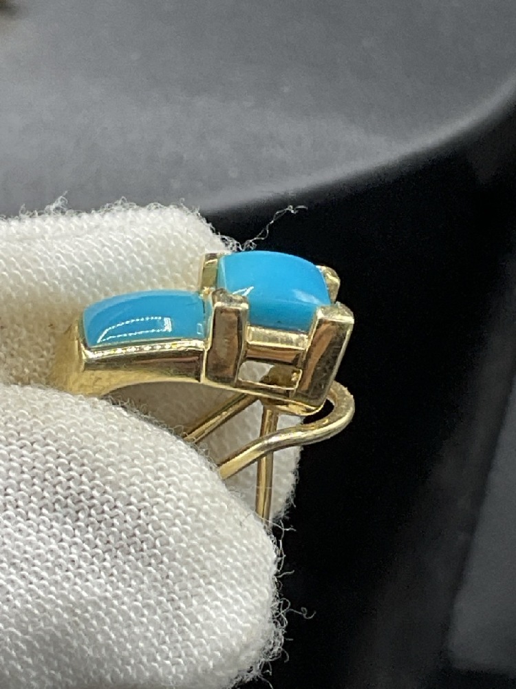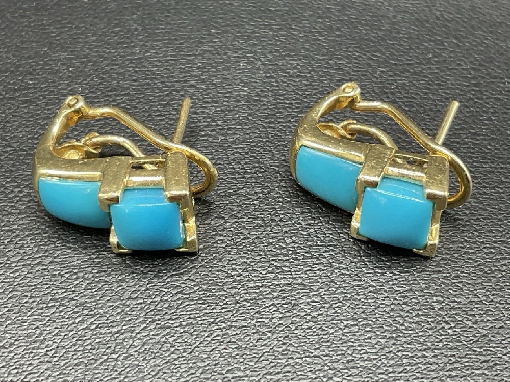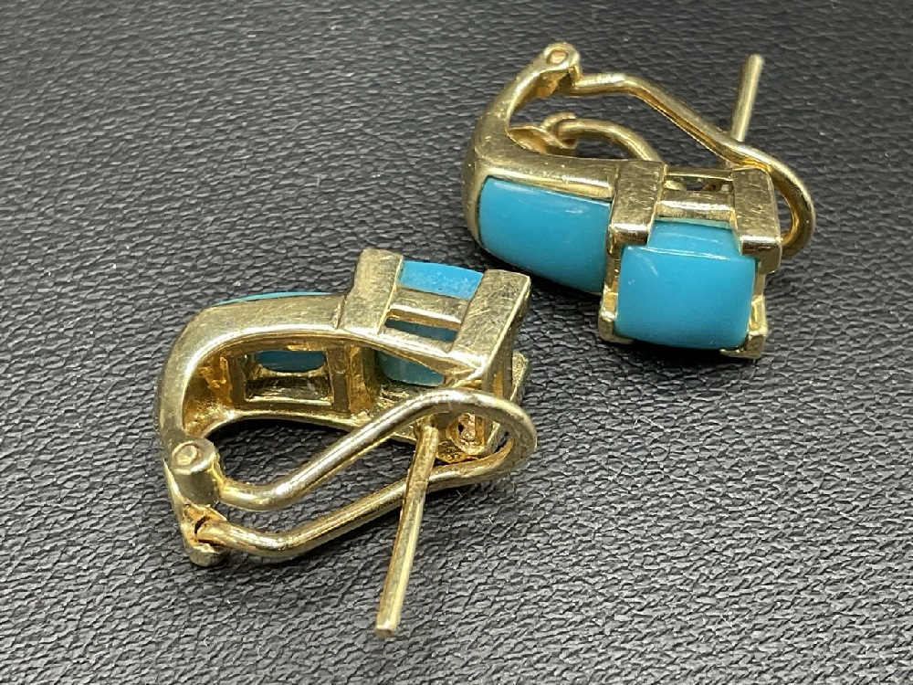 14K yellow gold persian turquoise earrings. Pierced backs. Dimensions: 1/2”