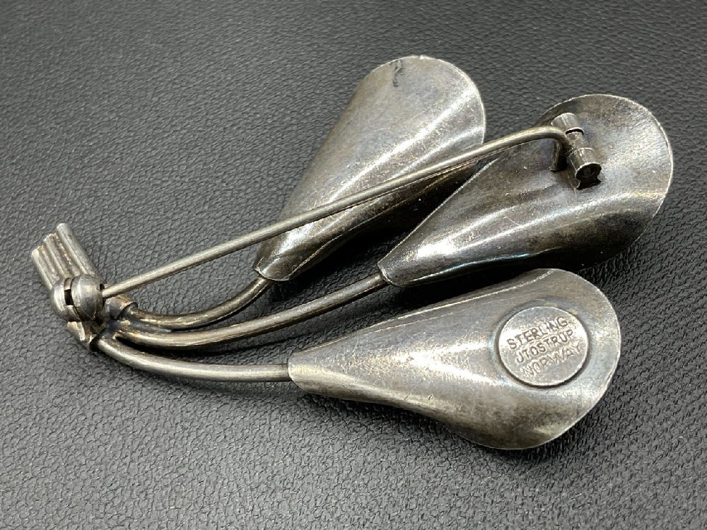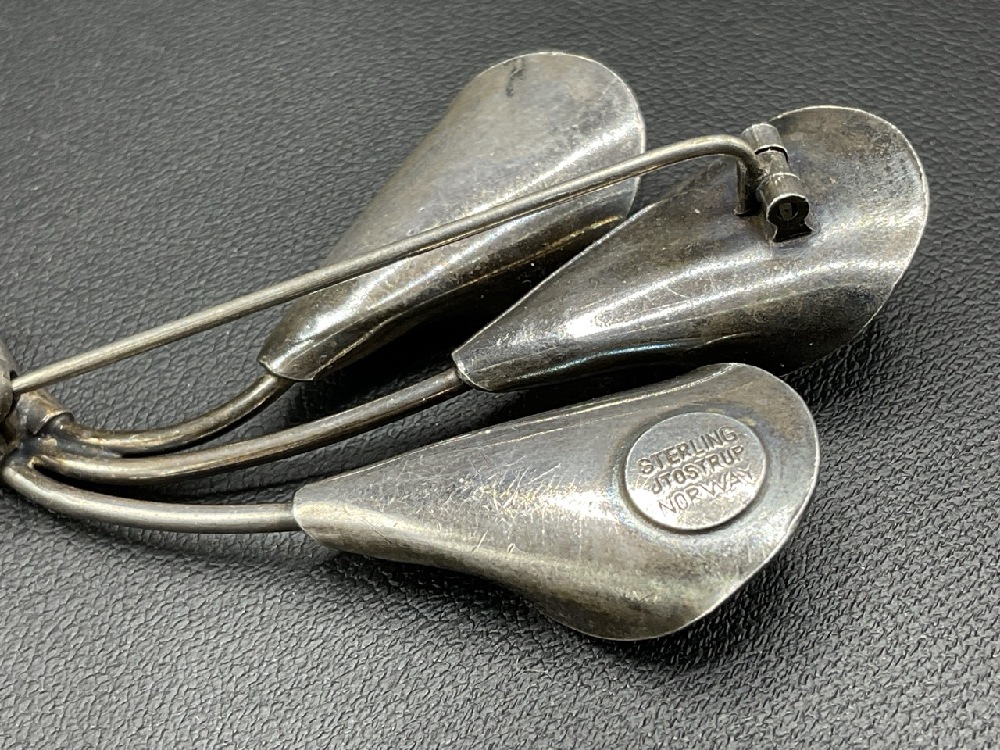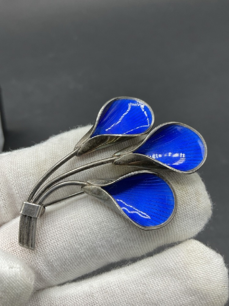 Grete Prytz Kittelsen for J. Tostrup Triple Lily Flower Blue Guilloche Pin. Sterling silver.