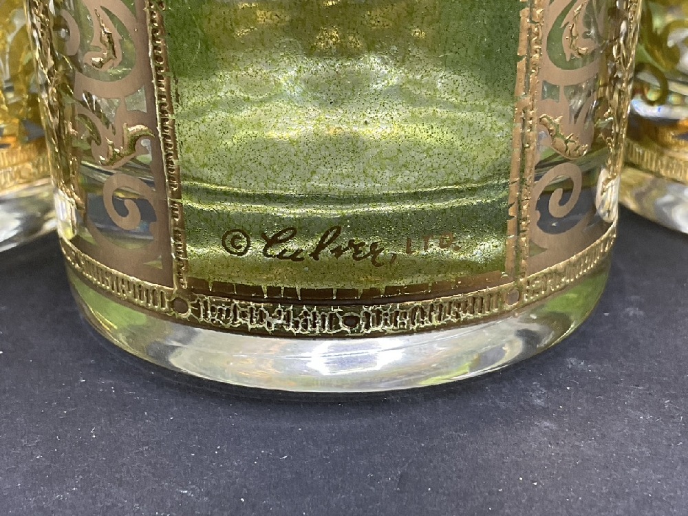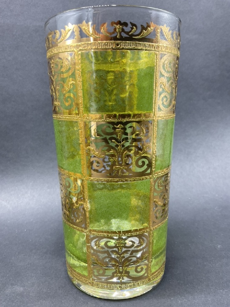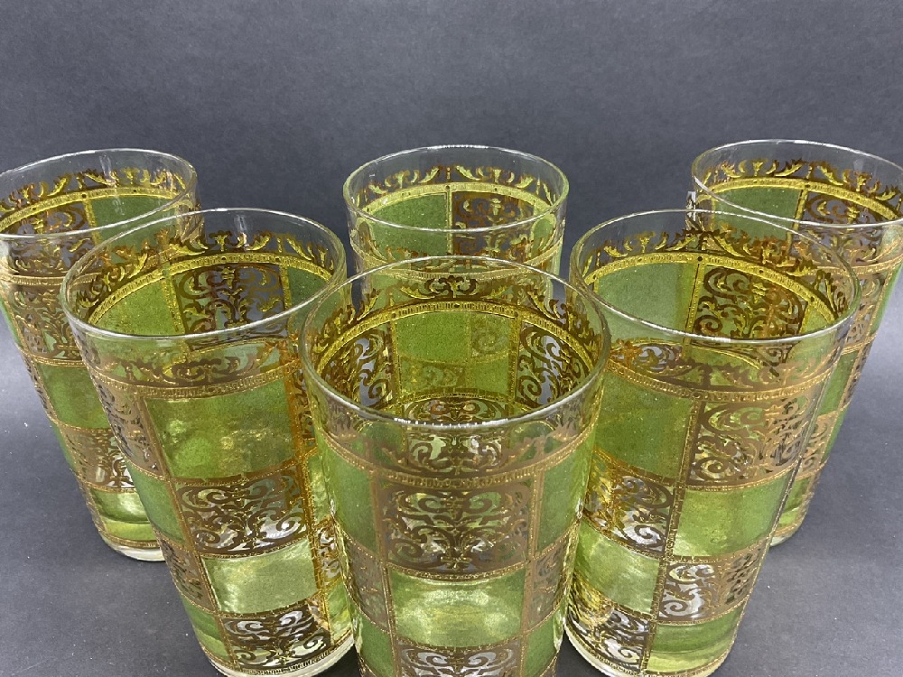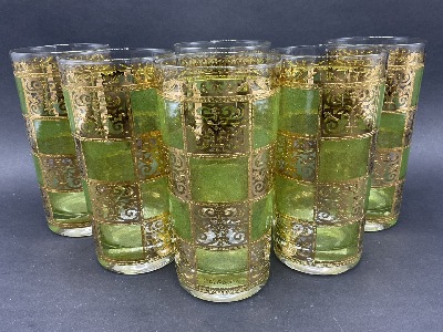 (6) 1960s Culver "Green Prada" Highball Glasses w/ 22K Gold Overlay.