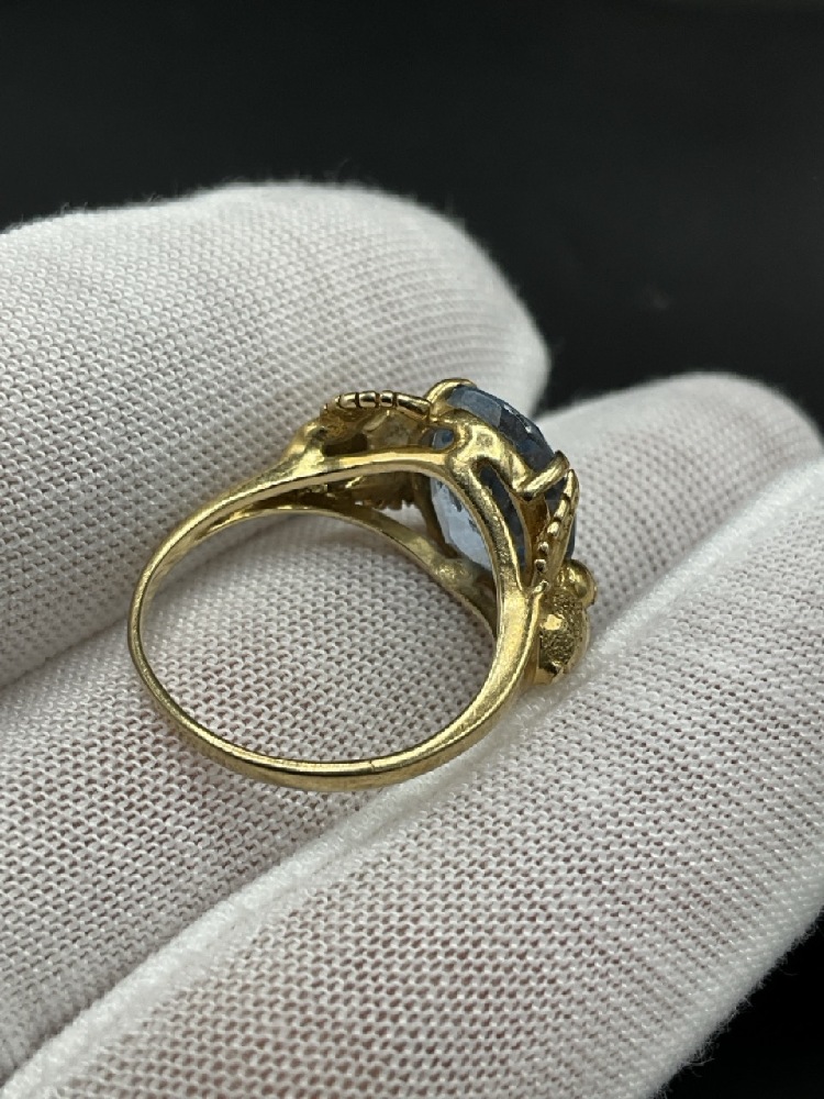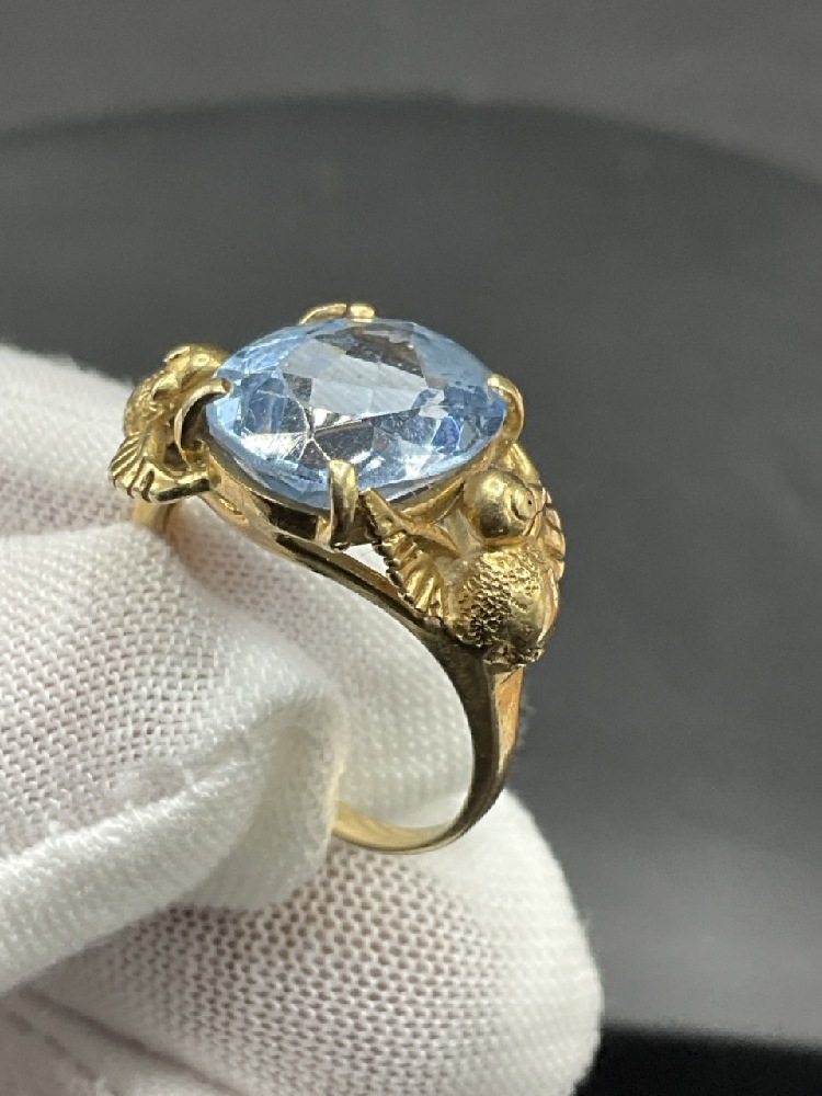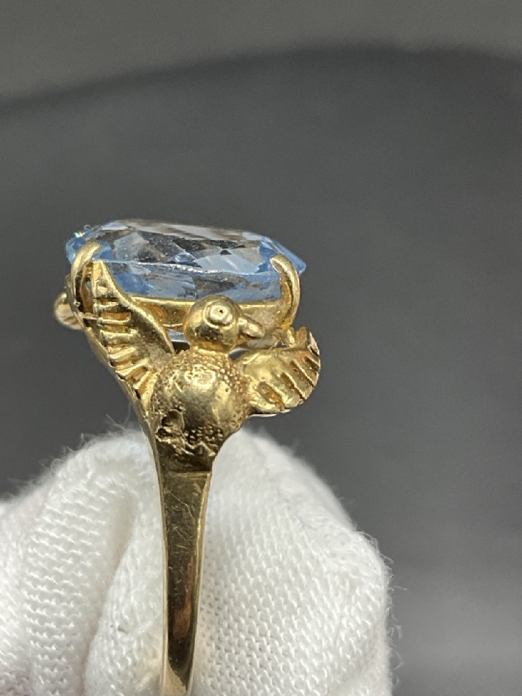 14K Yellow Gold Blue Topaz Ring with Bird Design along top side of shank. Size 8.