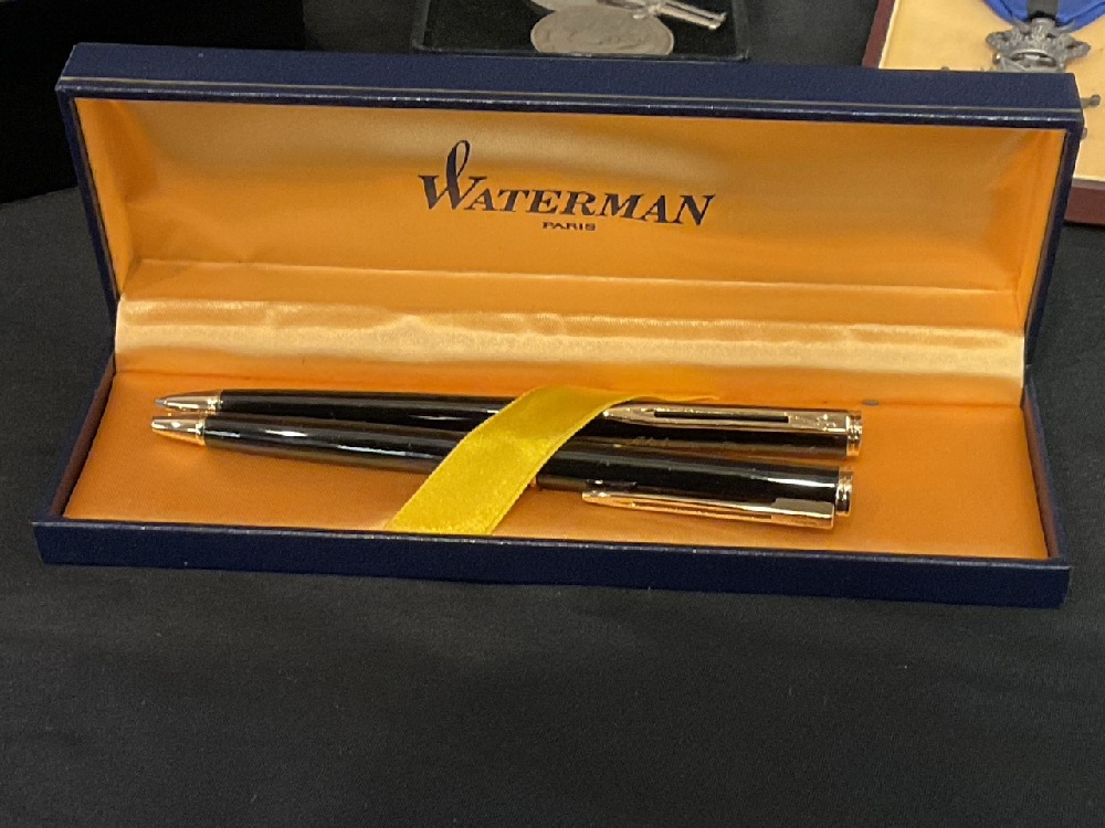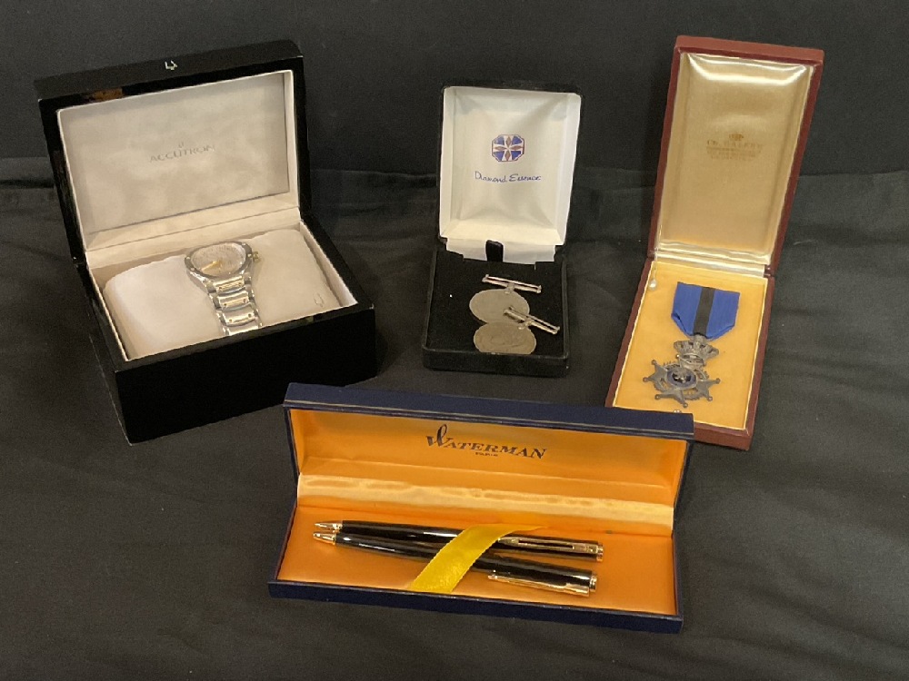 Curious Lot - Waterman Pens, Accutron Patriots Super Bowl Watch, WWII Medals, Belgium Military Medal.