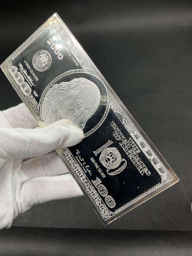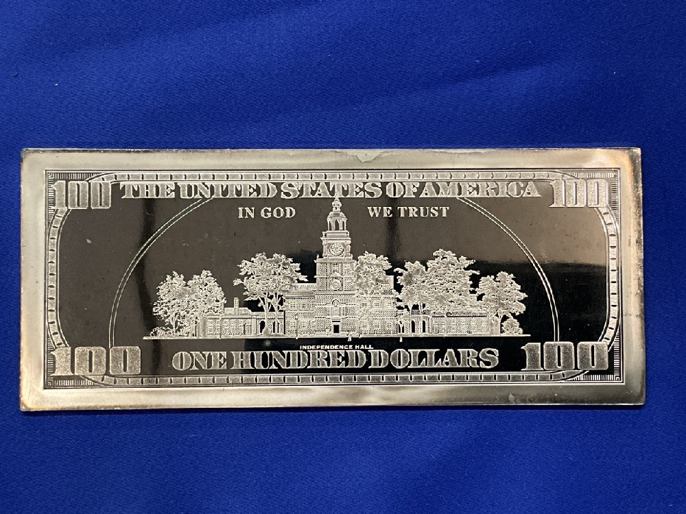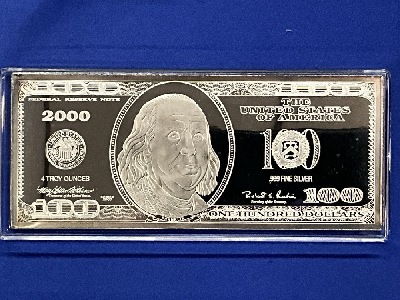 $100 .999 Silver Benjamin Note 4 Troy Ounces. Housed in plastic storage case.