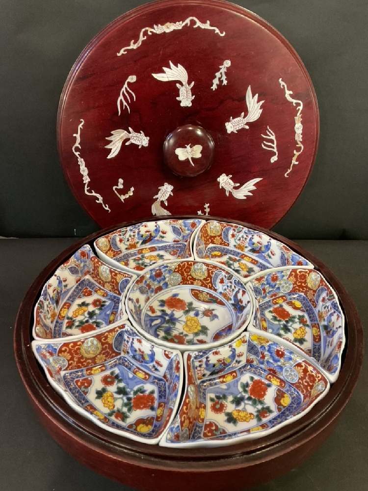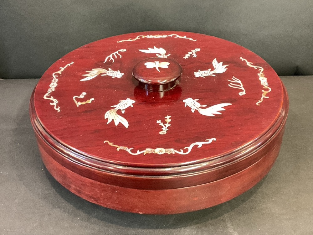 Vintage Asian Lazy Susan w/ Mother of Pearl Inlay. Lacquered box.