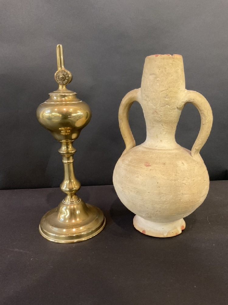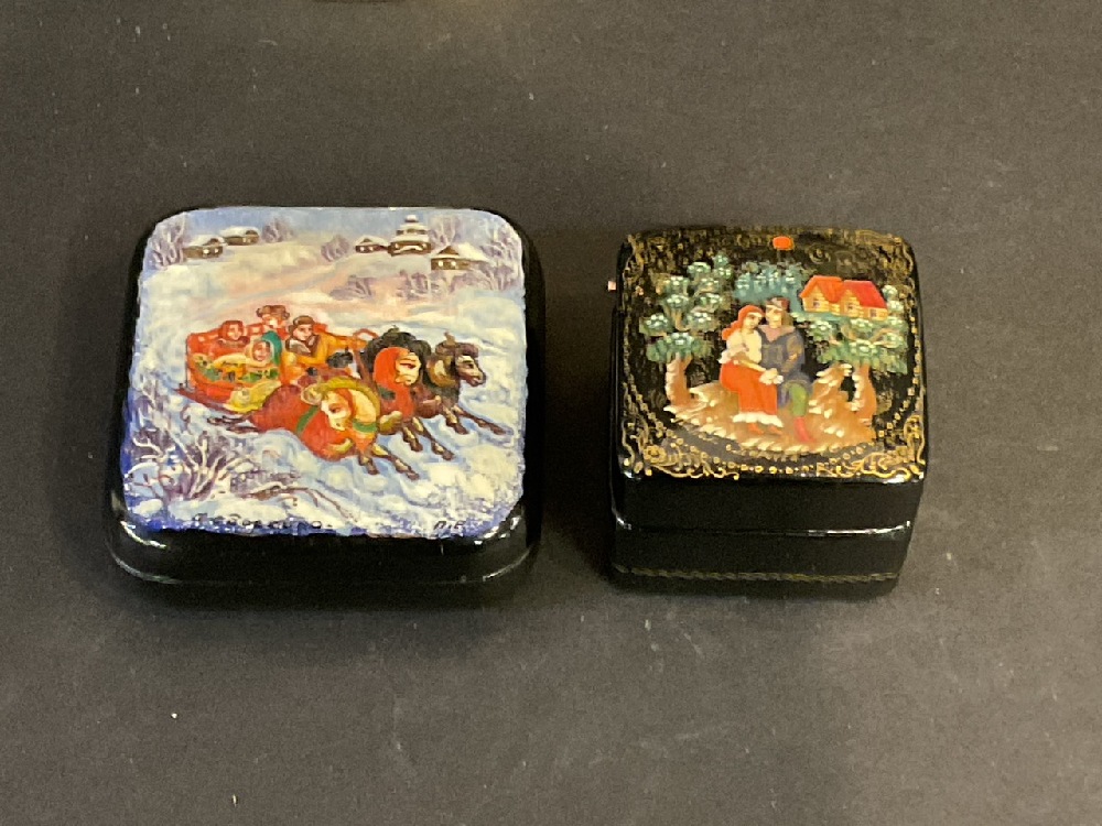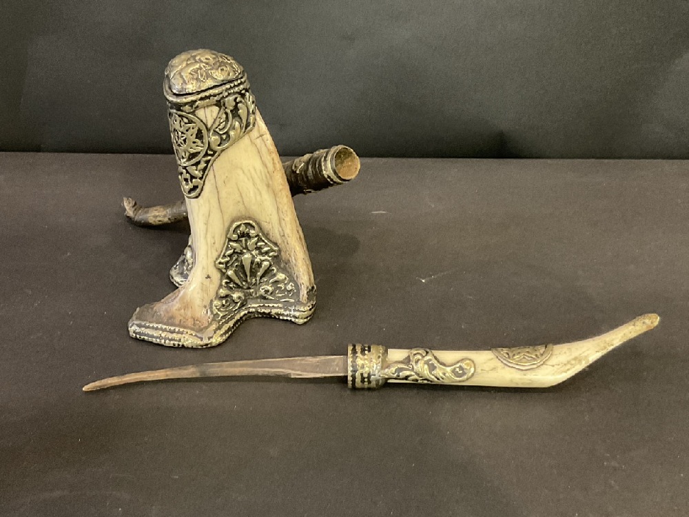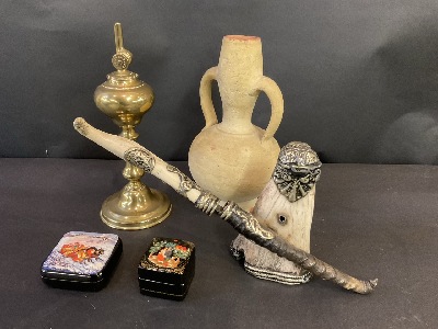 Curious Lot - French Brass Oil Lamp & Amphora, Russian Lacquer Trinket Boxes, Inkwell w/ Letter Opener.
