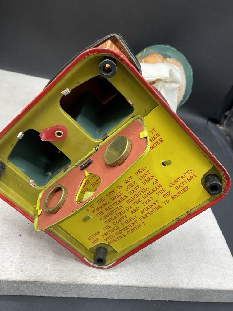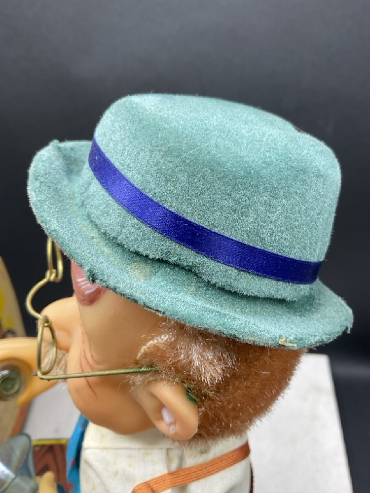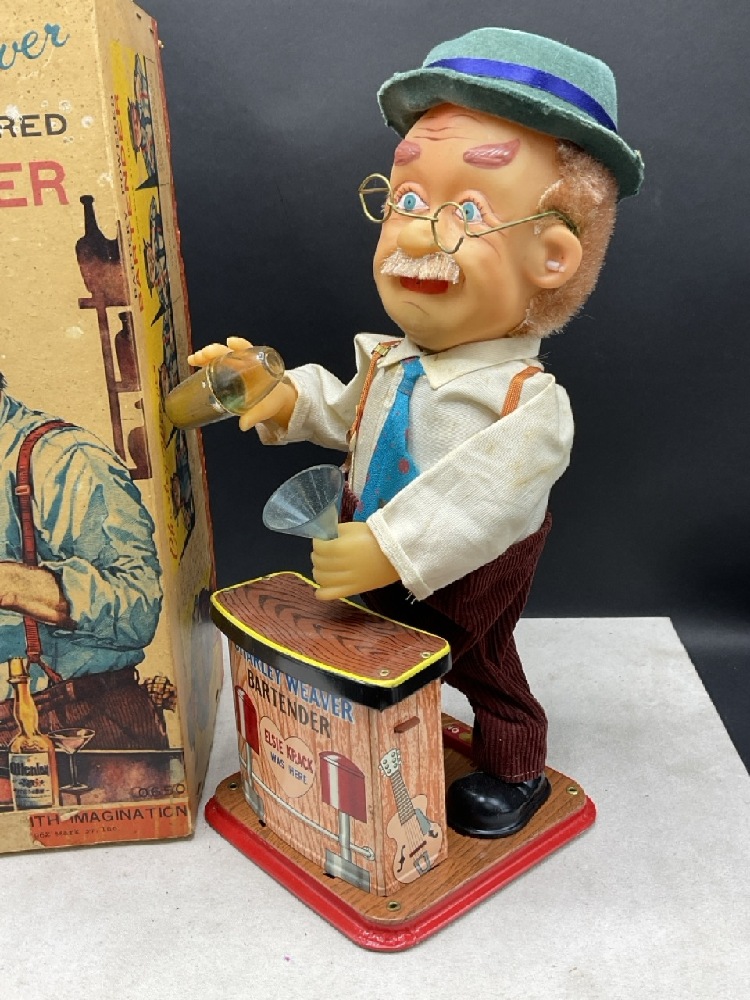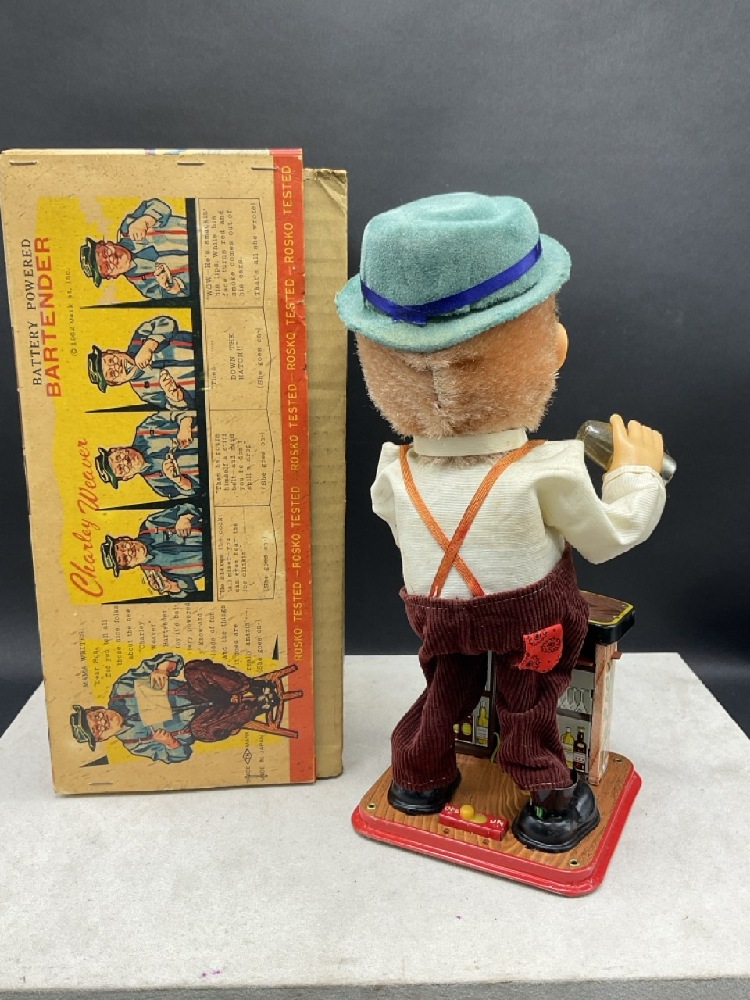 Charlie Weaver Bartender with Box Rosko Toy Co. . Vintage tin battery operated toy. Not tested. Battery compartment clean and showing no wear. The hat has some loss to fabric. Please see photograph preview.