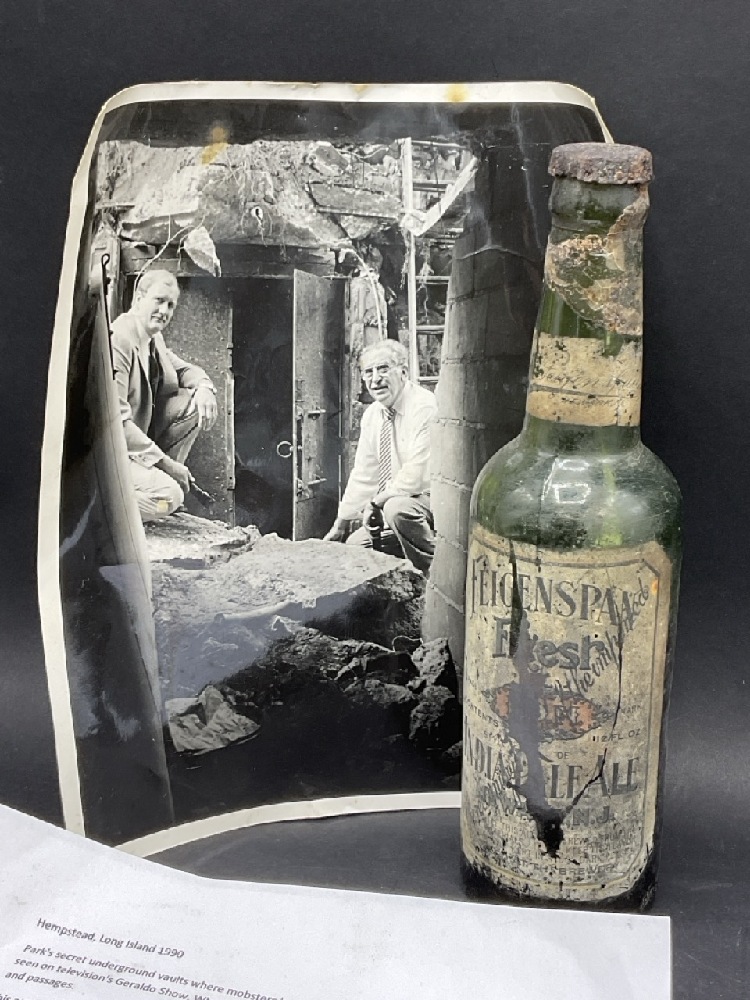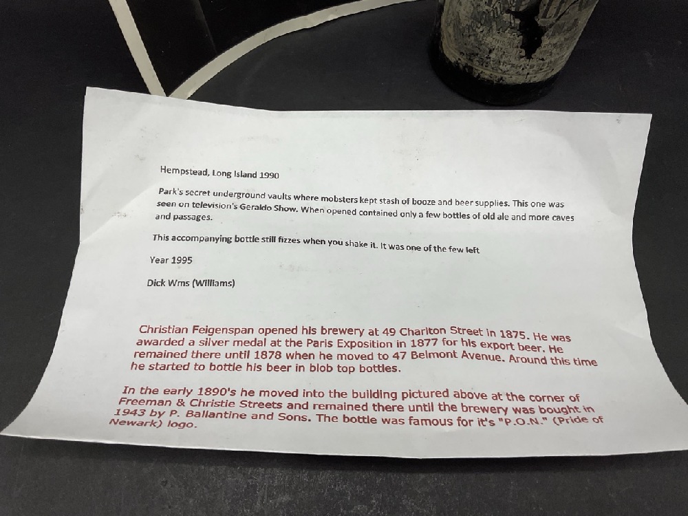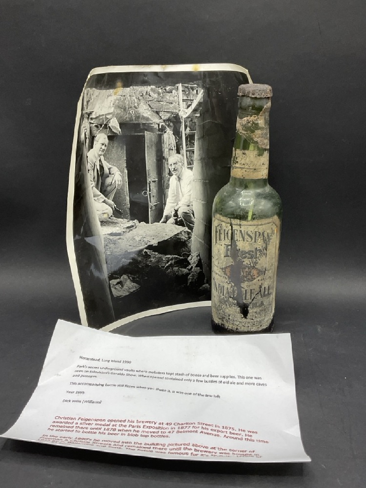 Christian Feigenspan Indian Ale Bottle Newark, NJ- Found in Park's Secret Underground Vault Hempstead Long Island. Includes photograph of dig.