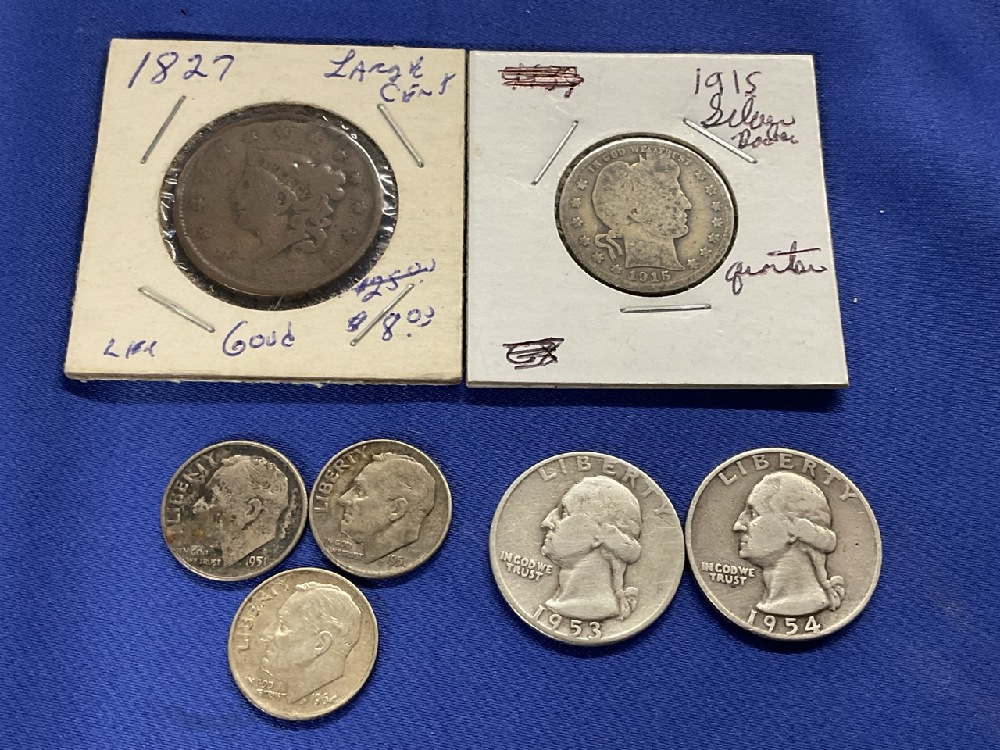 1827 Large Cent, 1915 Silver Barber Quarter, Three Dimes and Two Washington Quarters.