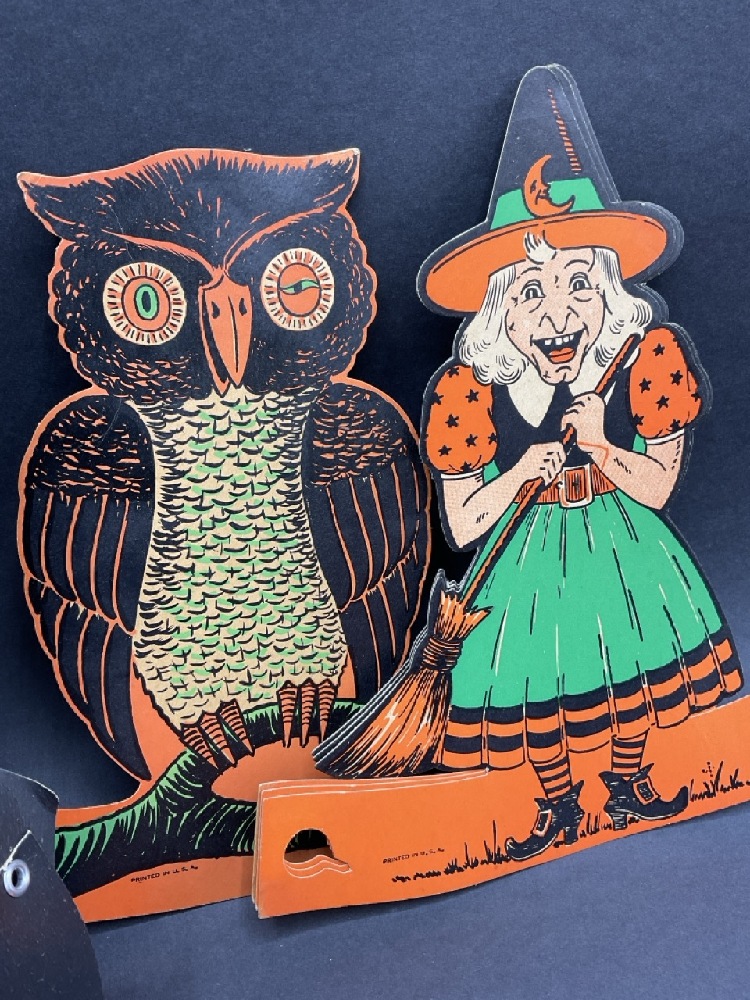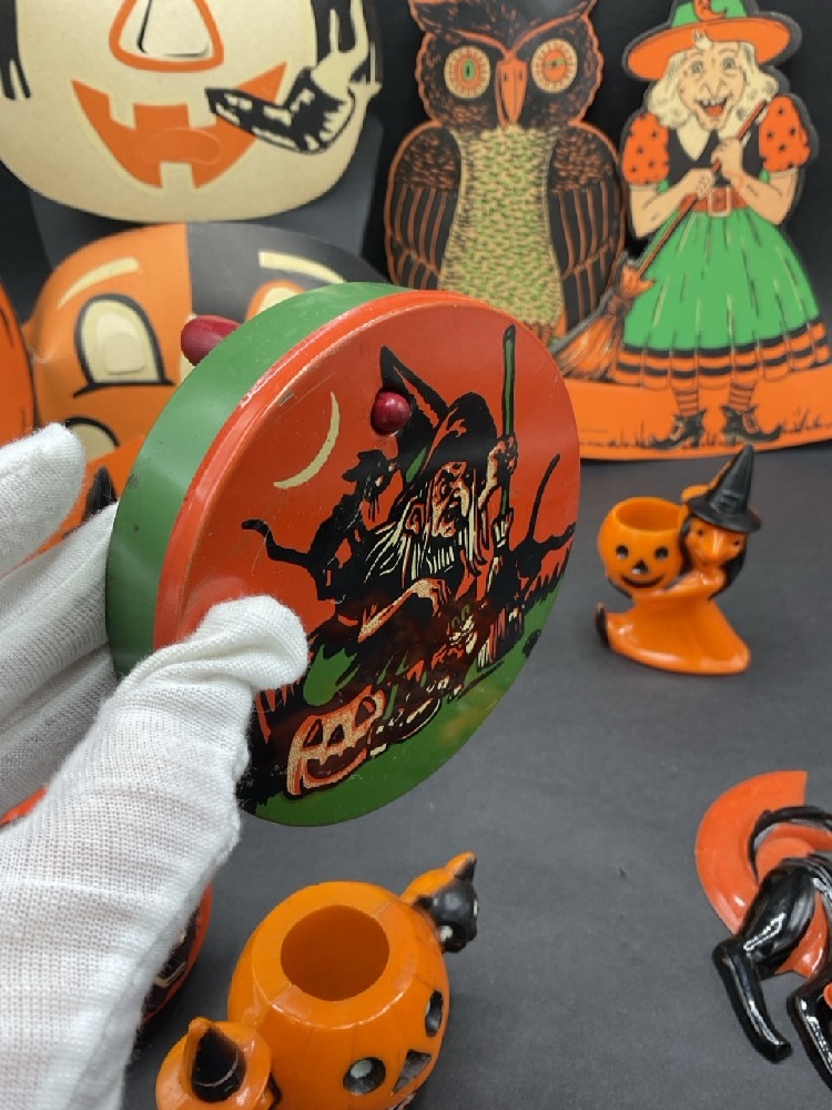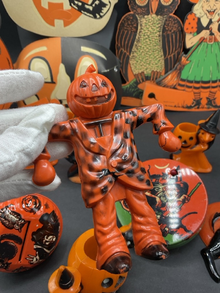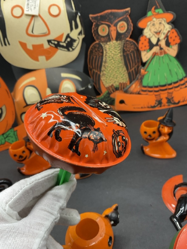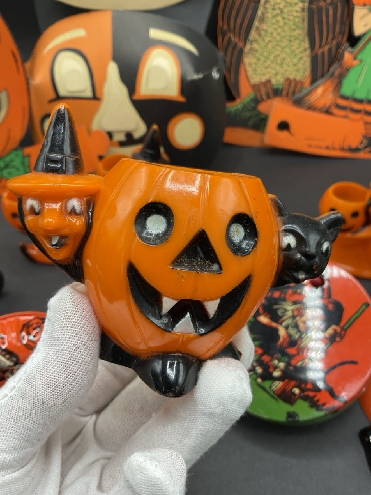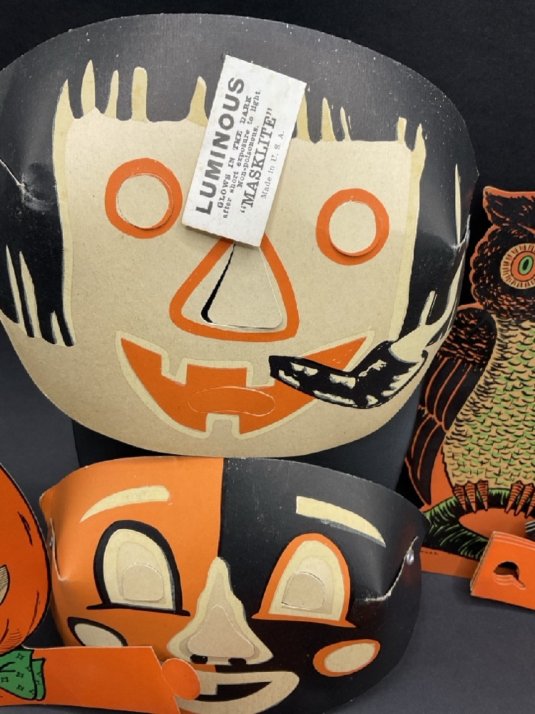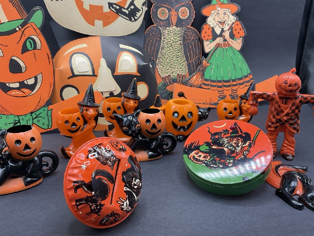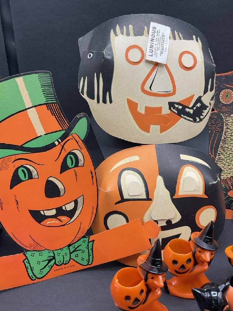 Compiled Collection of Vintage Halloween Decorations and Accessories. Masks, Candy Containers etc. Dimensions: Sm - 2 1/4” x 3 1/2”