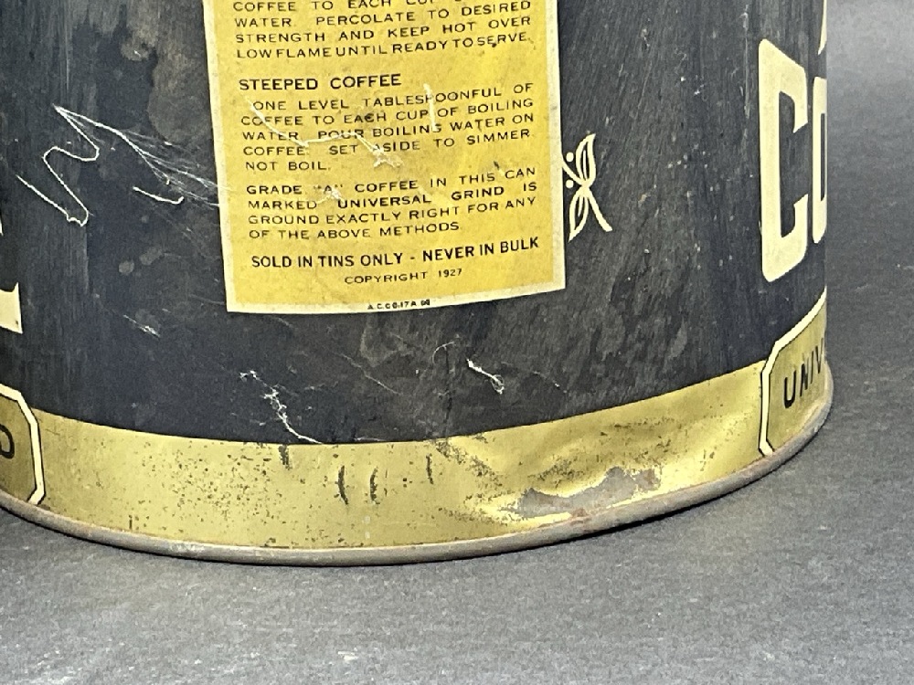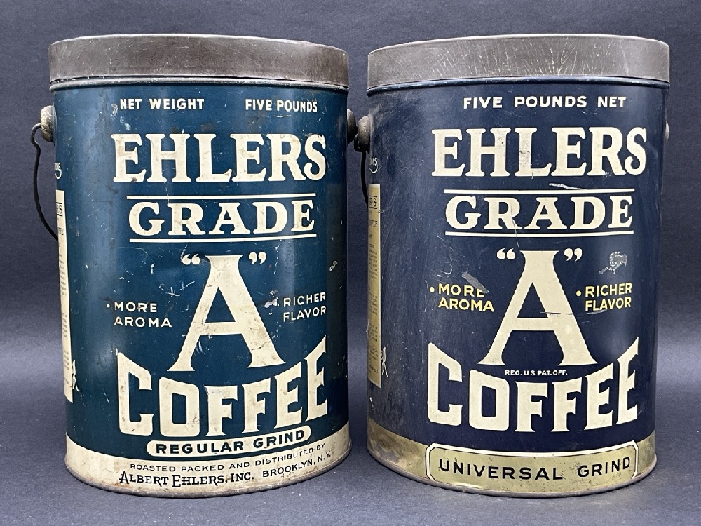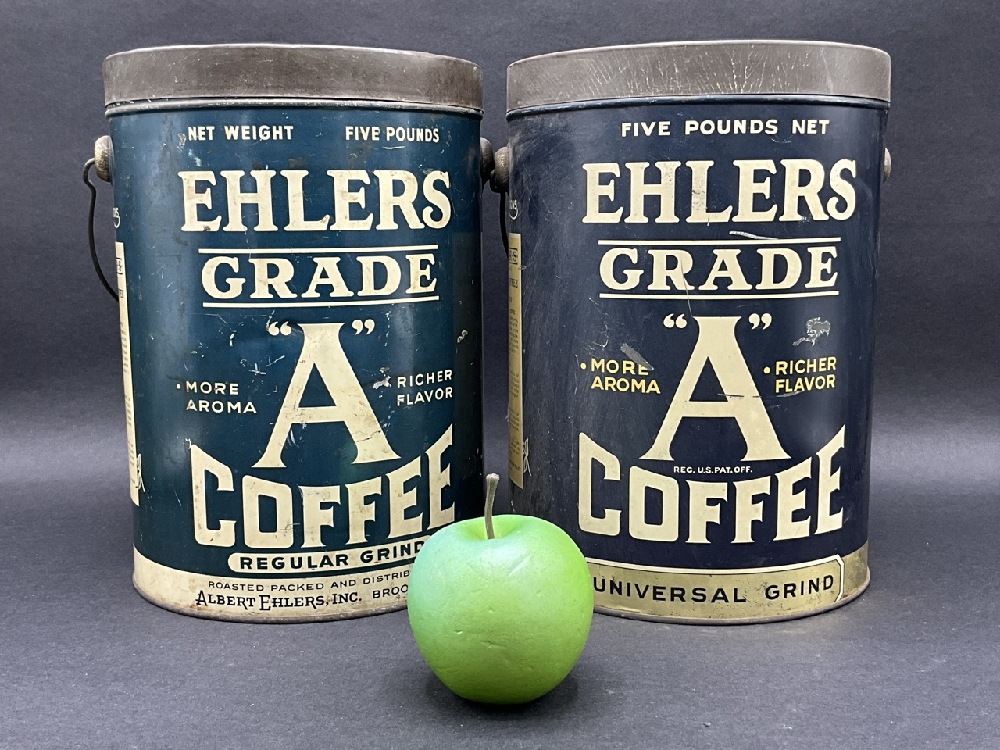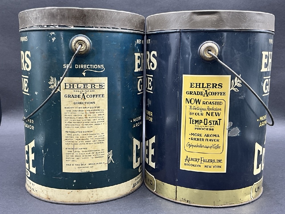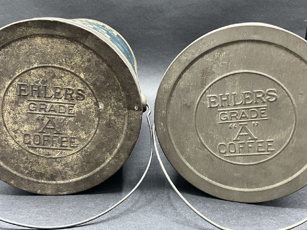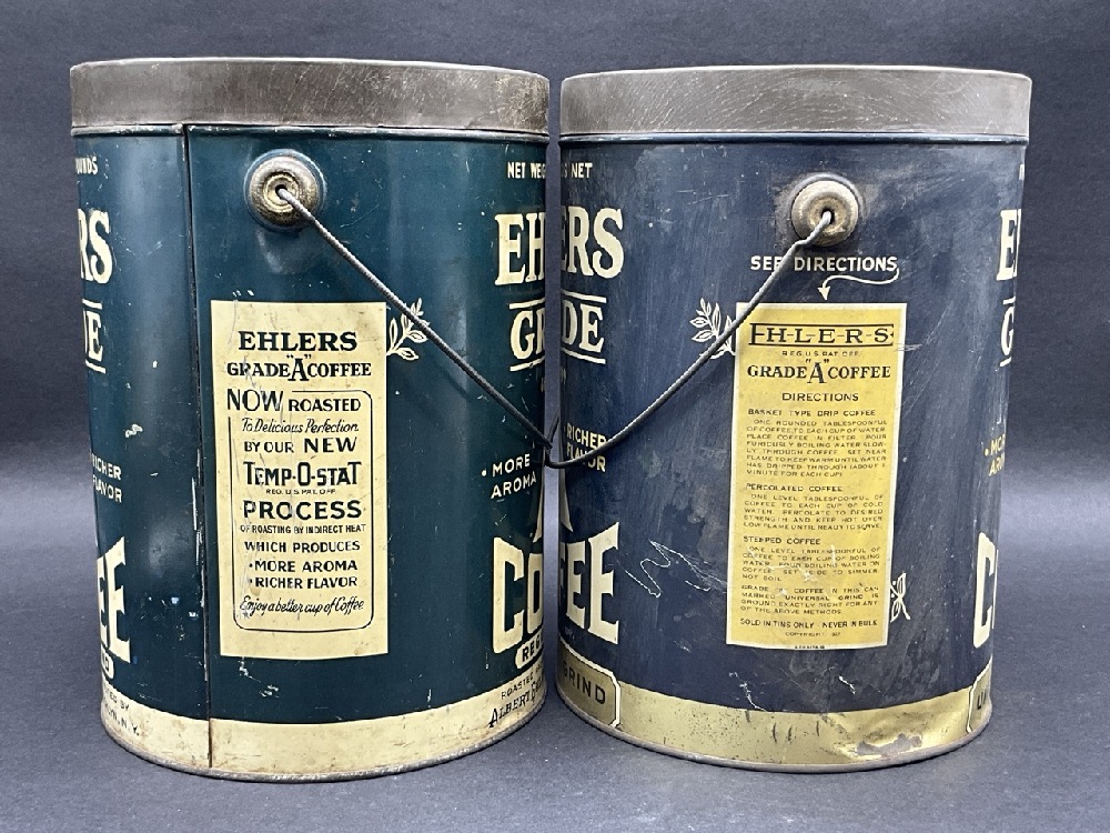 Ehler’s Grade “A” Five Pounds Coffee Containers. Two Metal Containers with Handles.