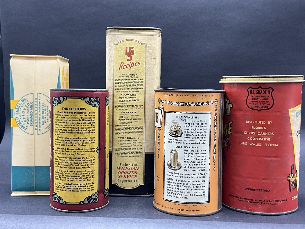 Vintage Advertising Containers (5) Pieces. Foremost Skimmed Milk, Dr. LeGear’s Lice Powder, Bespak Cocoa, Ovaltine, and Donald Duck Orange Juice.