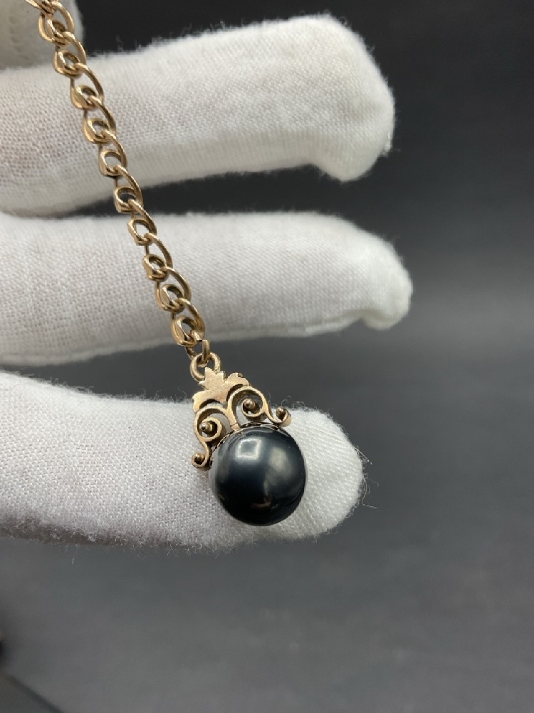 Antique 14K (585) Yellow Gold Black Pearl Watch Fob Chain.