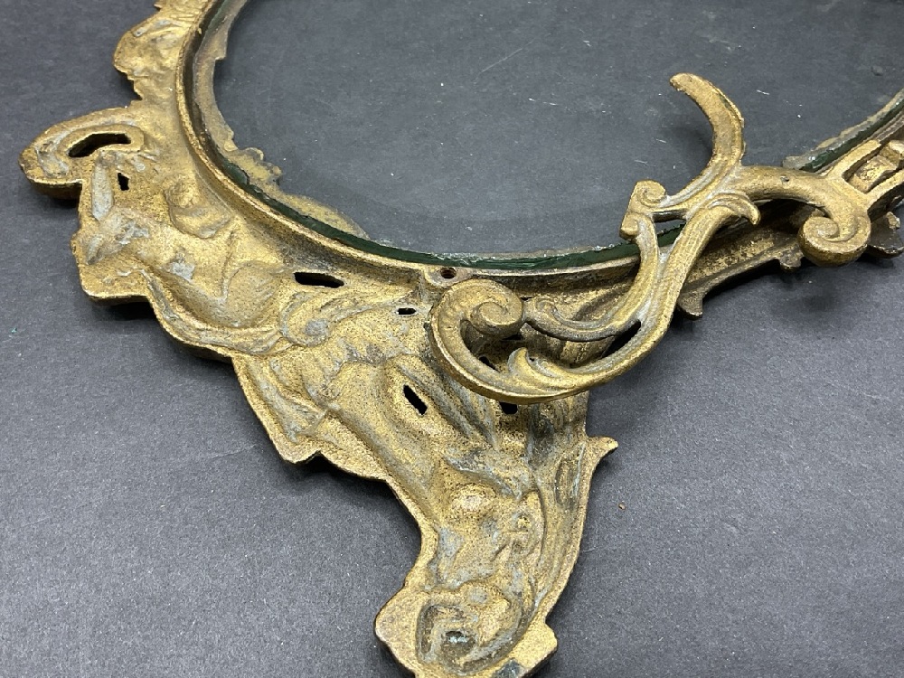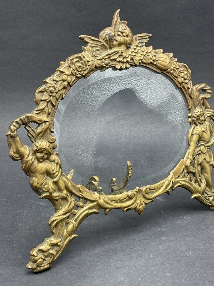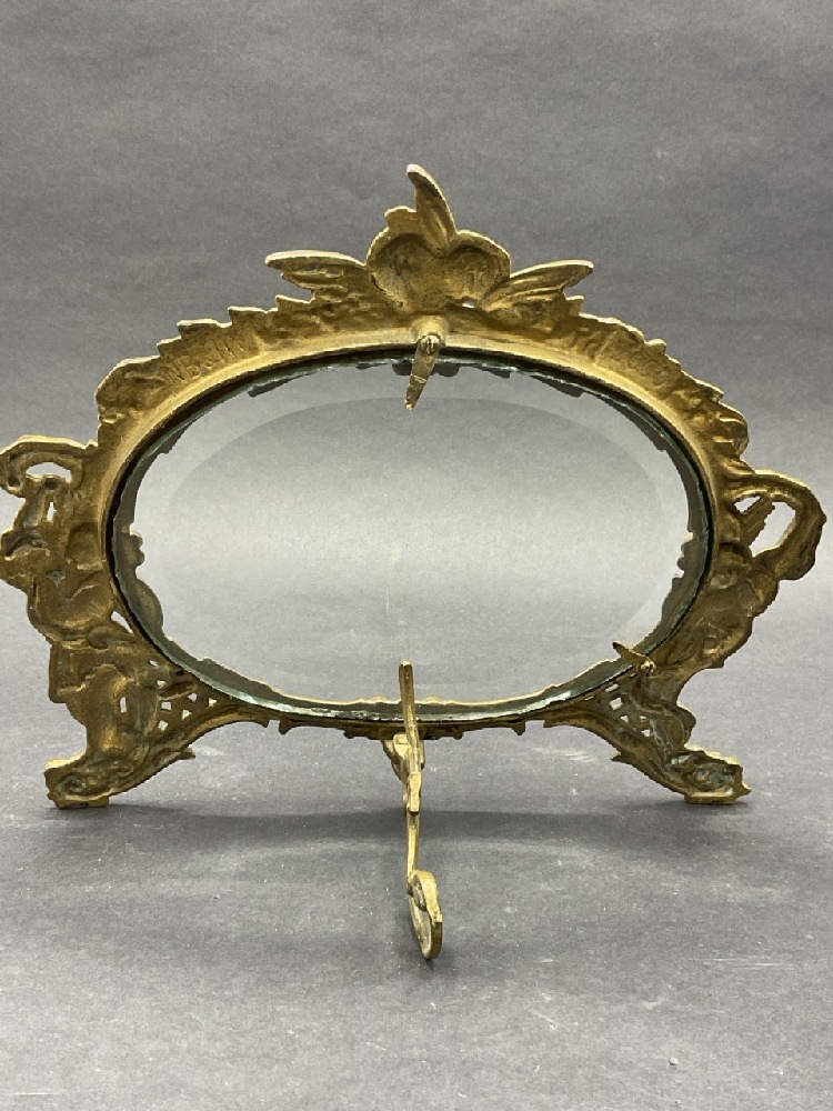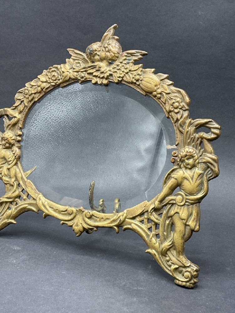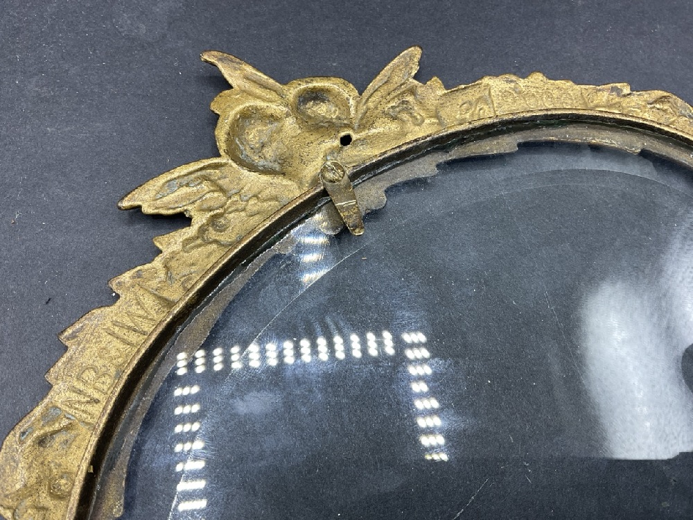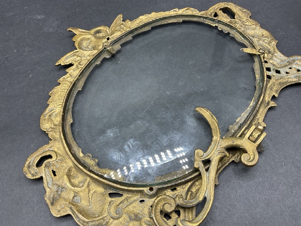 National Brass and Ironworks of Reading Pennsylvania. Signed NB&IW. Early 20th century. Iron with gold finish. Excellent patina. Glass has some edge chips. Please see photograph preview.