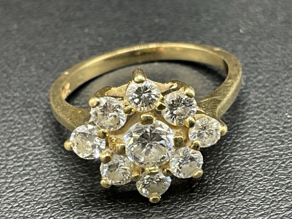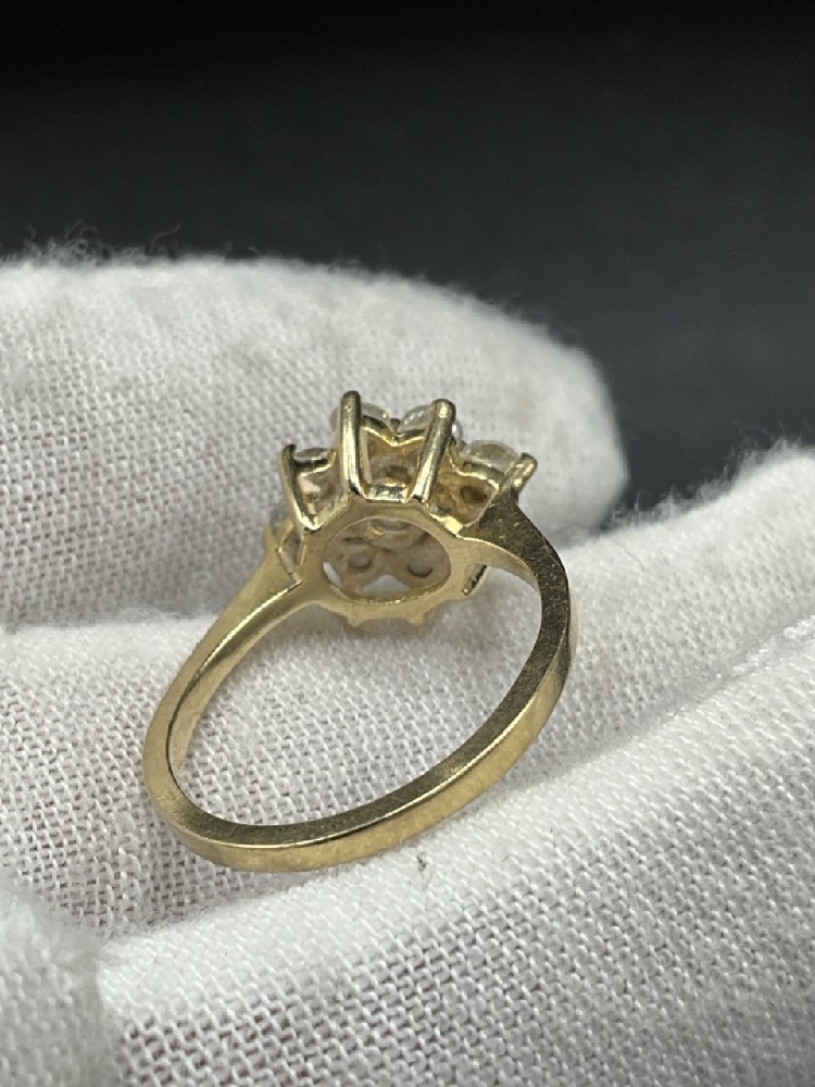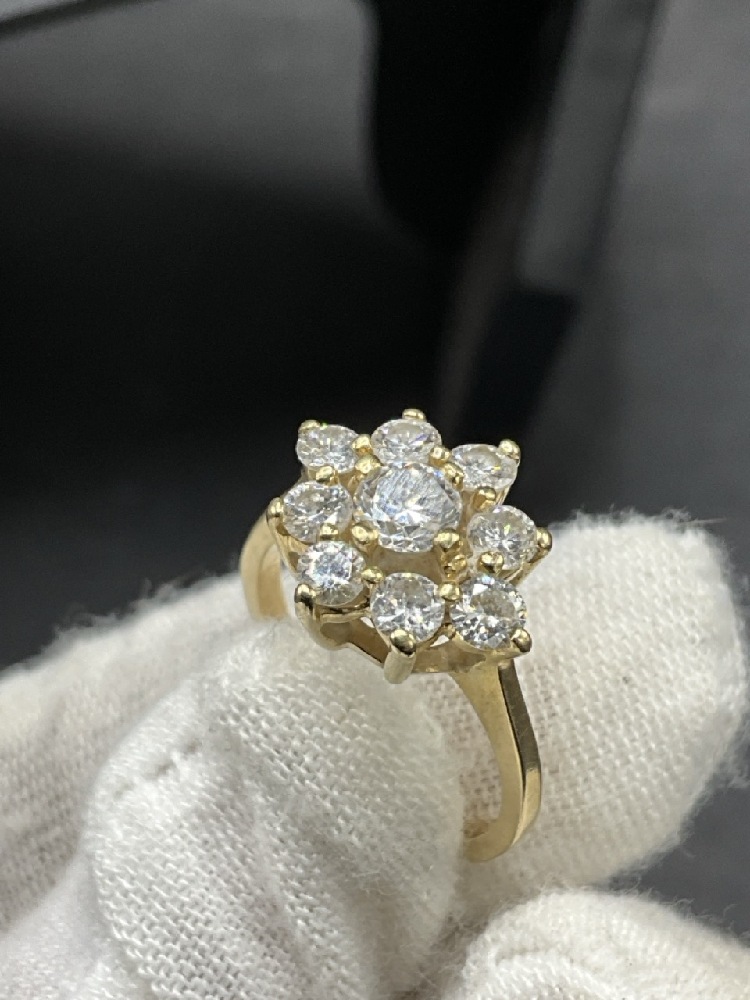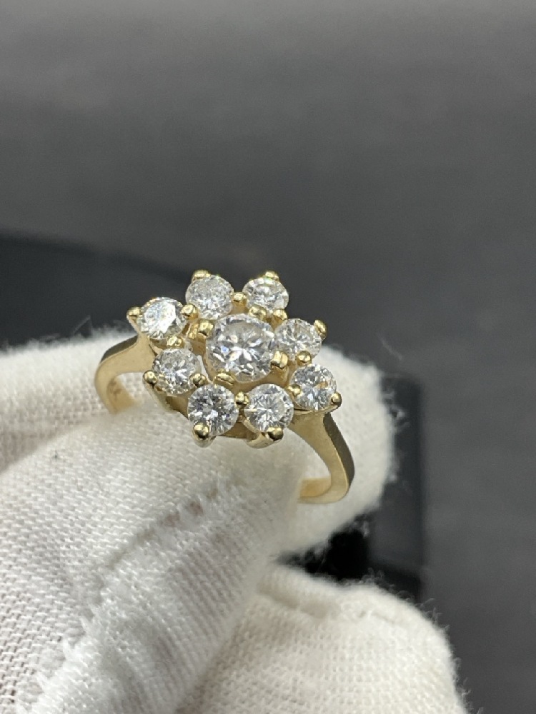 Center Diamond surrounded by eight brilliant diamonds. Estate found. Tested.