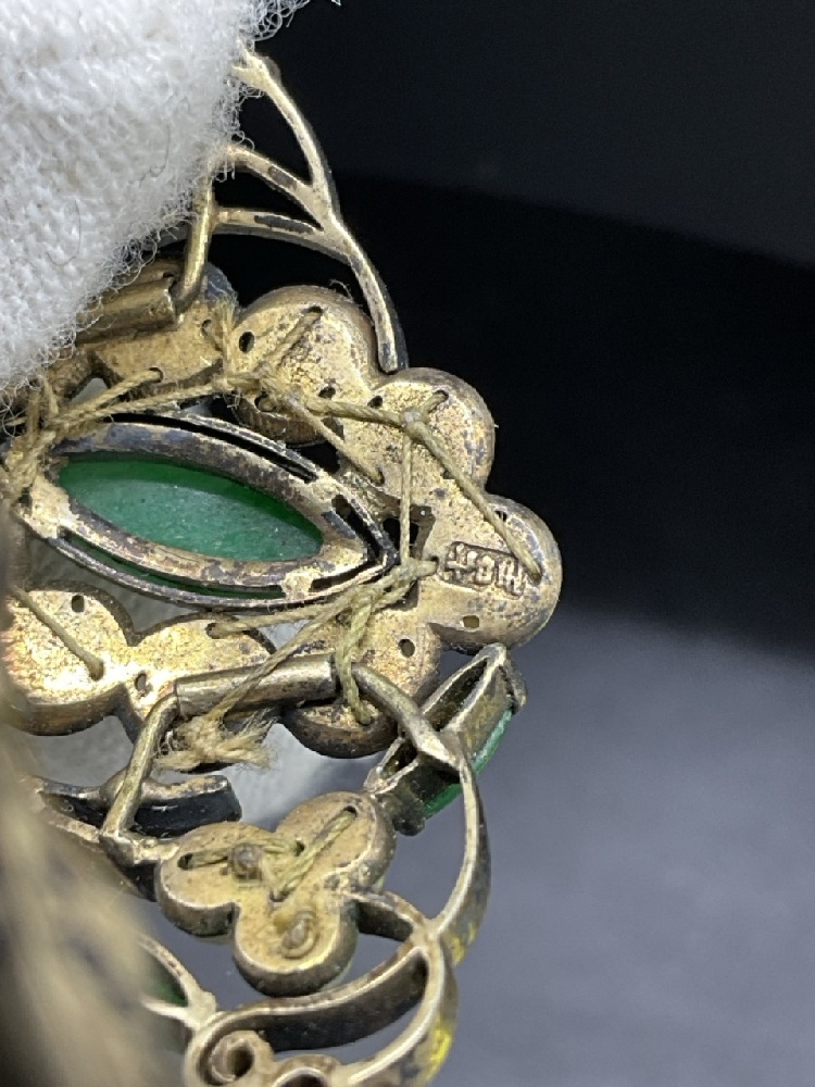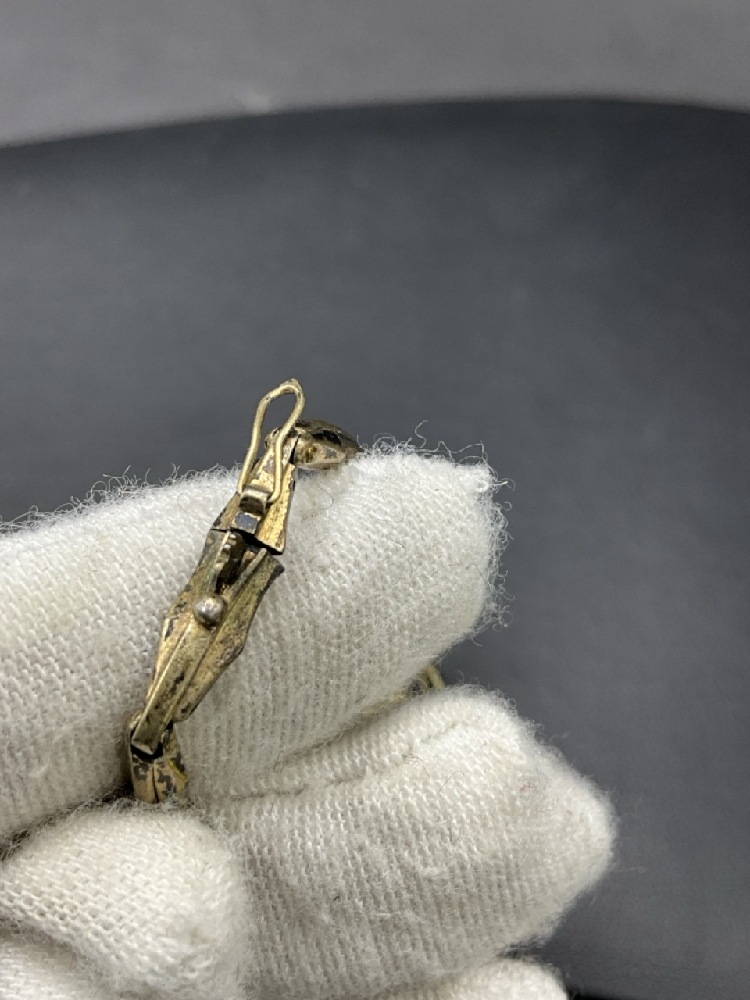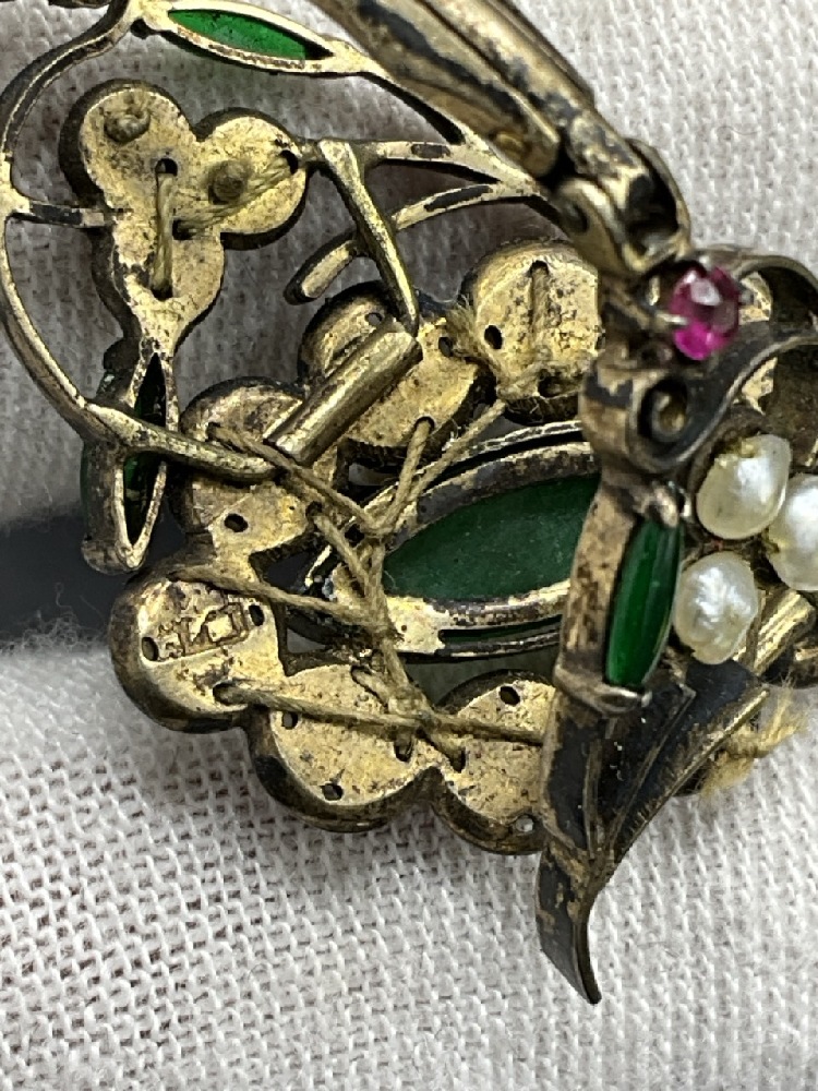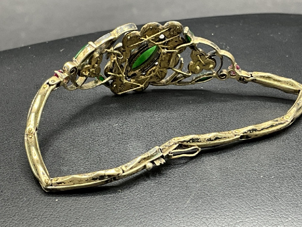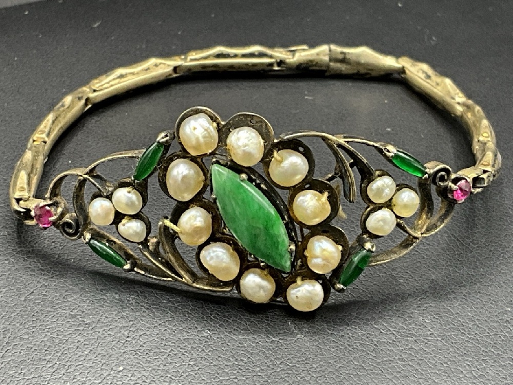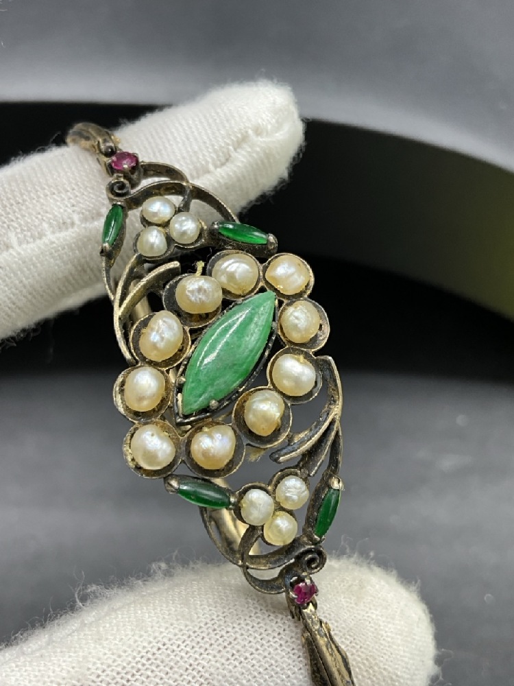 Antique Edwardian Gold Bracelet. Tested 14K yellow gold. Emeralds, Pearls and Ruby Colored stones.