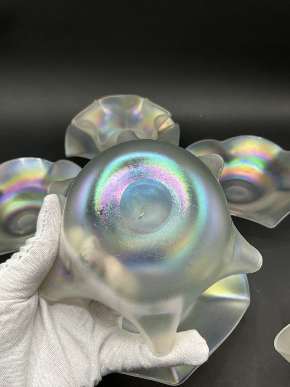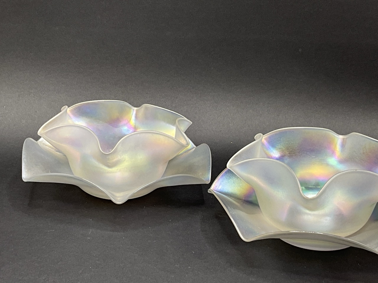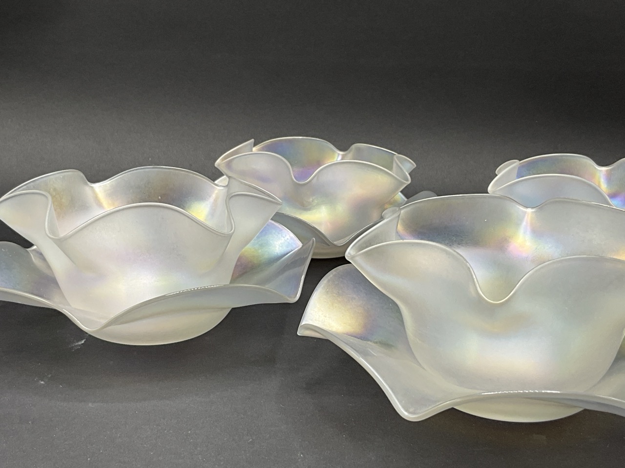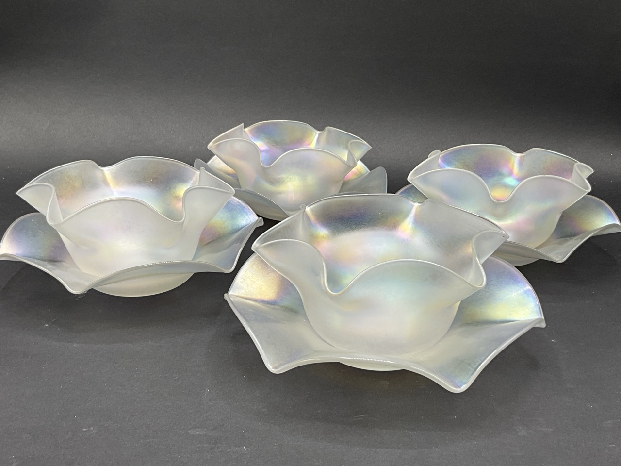 Set of Four Steuben Verre De Soie Fruit Bowls and Underplates. Early 20th century.