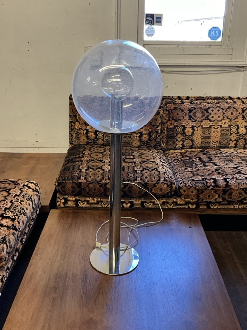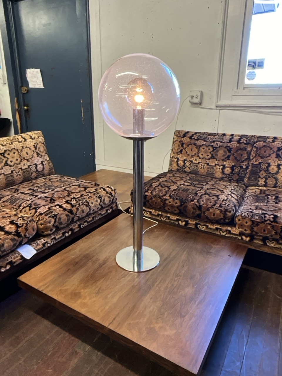 Robert Sonneman 1960's Atomic Style Chrome and Glass Globe Lamp, An oversized table top style with speckled clear glass globe.