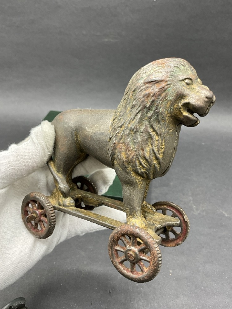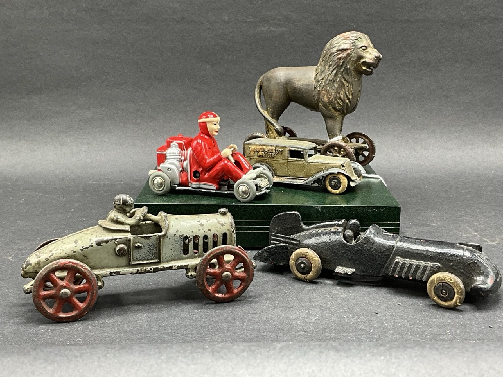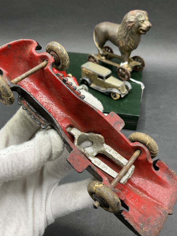Five (5) Piece Antique Toy Cars and Lion Bank.