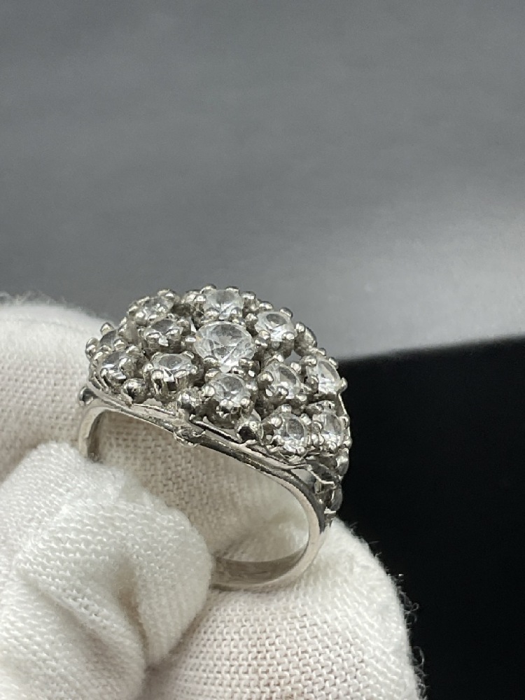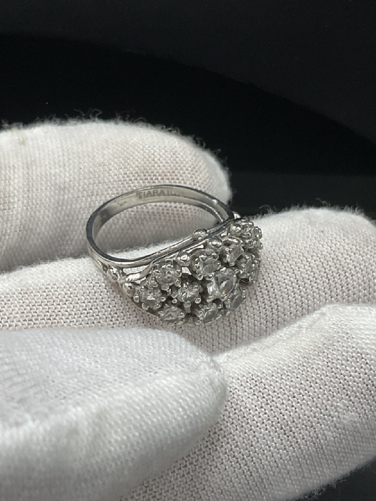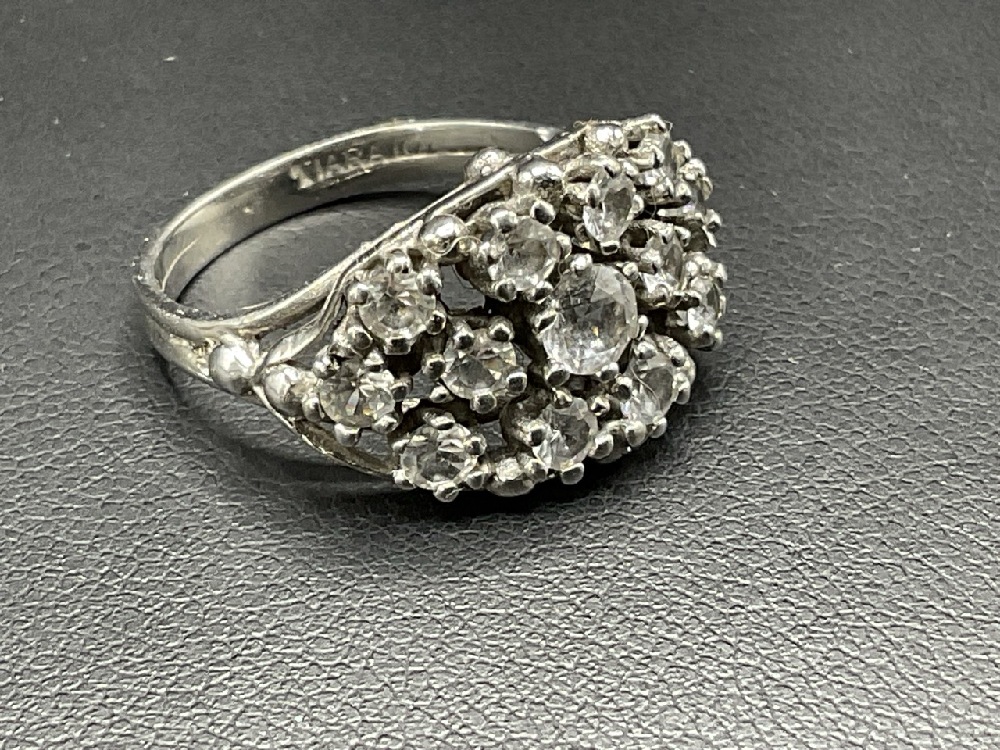 Signed Tiara 10K White Gold White Sapphire Cluster Ring.