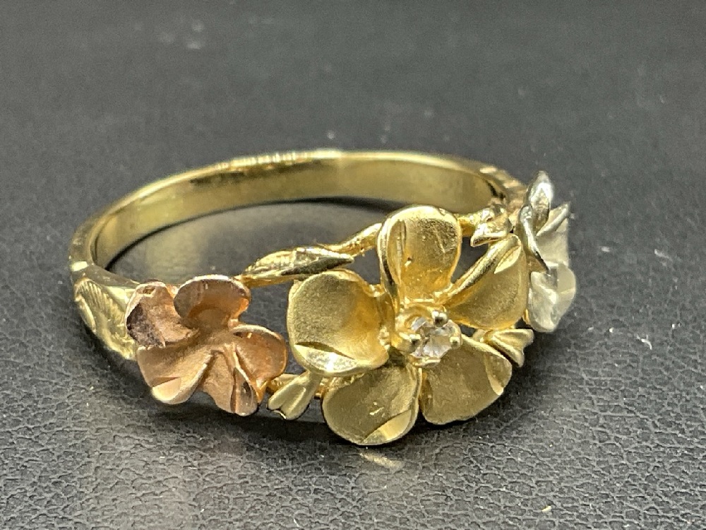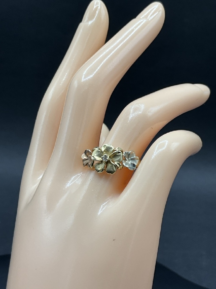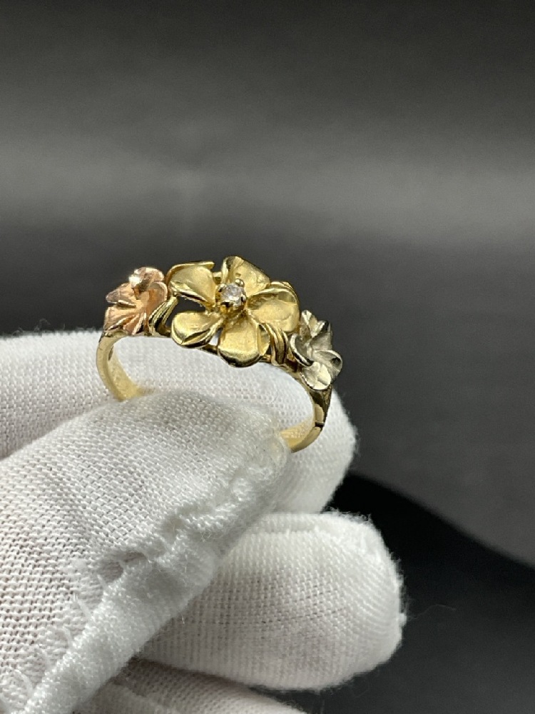 14K Tri-Gold Hawaiian Flower Form Ring with Diamond.