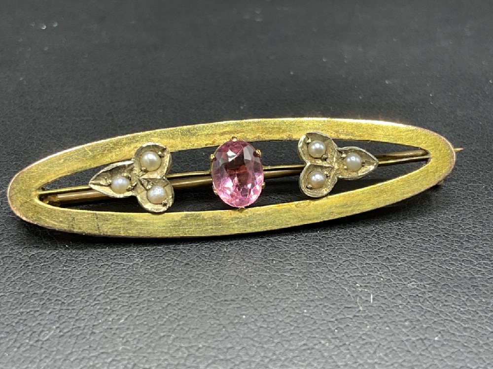 Antique English 9ct. Gold Pin with ruby colored stones and seed pearls.
