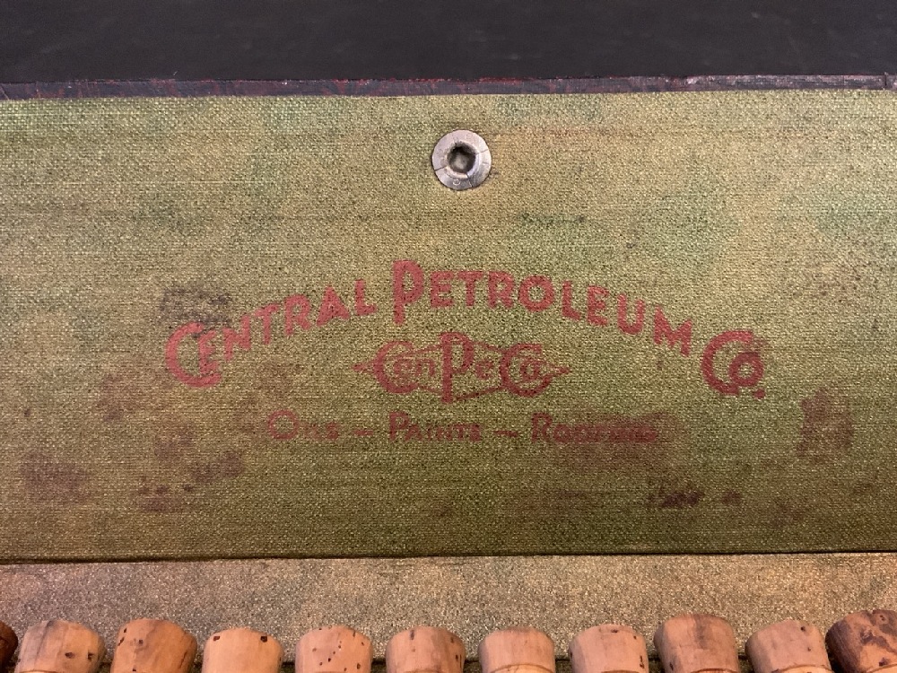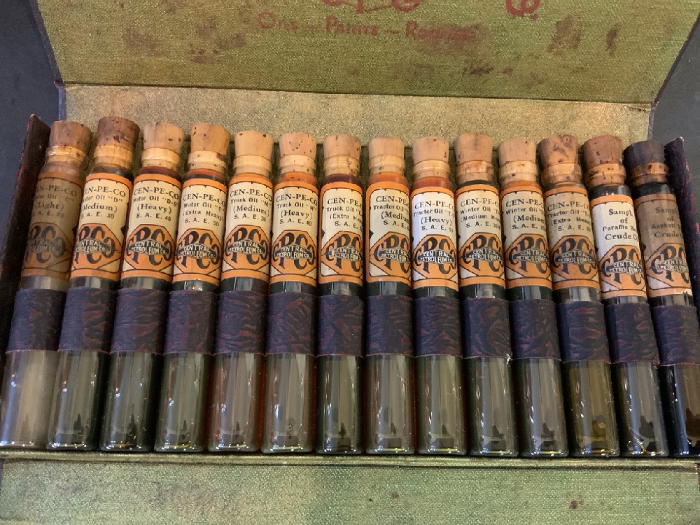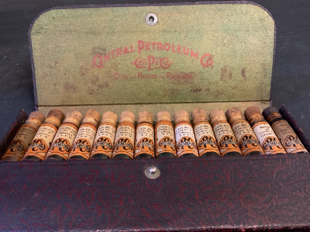 Central Petroleum Co. Cen-Pe-Co Oil Glass Vials in Original Case. Salesman Sampler. Early 1900's.