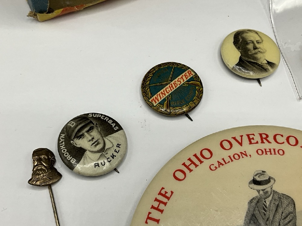 Collection of Advertising, Brooklyn Dodgers pin, Hand Mirrors, Worlds Fair, Victorian medicinal tin, political buttons etc.