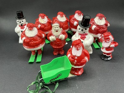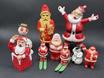 (9) Vintage Celluloid & Plastic Santas & Snowmen. Dimensions: