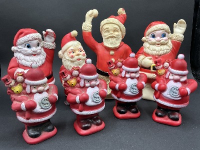 (8) Vintage Rubber Santas. Dimensions: Sm - 6 1/2” x 4 1/2” x 3” Lg - 11” x 6” x 4”