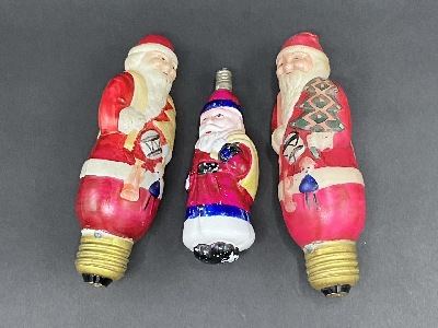 (3) Vintage Santa Lightbulbs. Condition: The two larger bulbs did not work when tested. Dimensions: Lg - 5 1/4” x 2” Sm - 4” x 1 1/2” x 1 1/2”