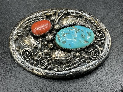 American Najaho Indian JM Sterling Silver Belt Buckle. Silversmith marks JM. Set with Turquoise and Red Coral stones. Total weight: 72.2 grams. Dimensions: 2 1/2” x 3 1/4”