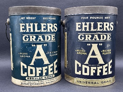 Ehler’s Grade “A” Five Pounds Coffee Containers. Two Metal Containers with Handles. Dimensions: 10”H x 7”D Good Condition, Please See Preview Photographs