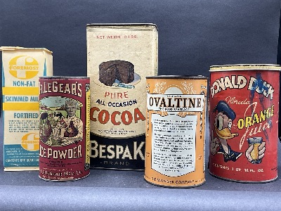 Vintage Advertising Containers (5) Pieces. Foremost Skimmed Milk, Dr. LeGear’s Lice Powder, Bespak Cocoa, Ovaltine, and Donald Duck Orange Juice. Dimensions: Range 6 1/4” H - 9 1/2” H Good Condition, Please See Preview Photographs