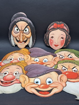 Par-T-Masks 1937 Walt Disney Enterprise. Eight (8) Masks Never Used. The Witch, Snow White, DOC (2), Dopey (2), Grumpy (2) Dimensions: Range 11”-14”” L