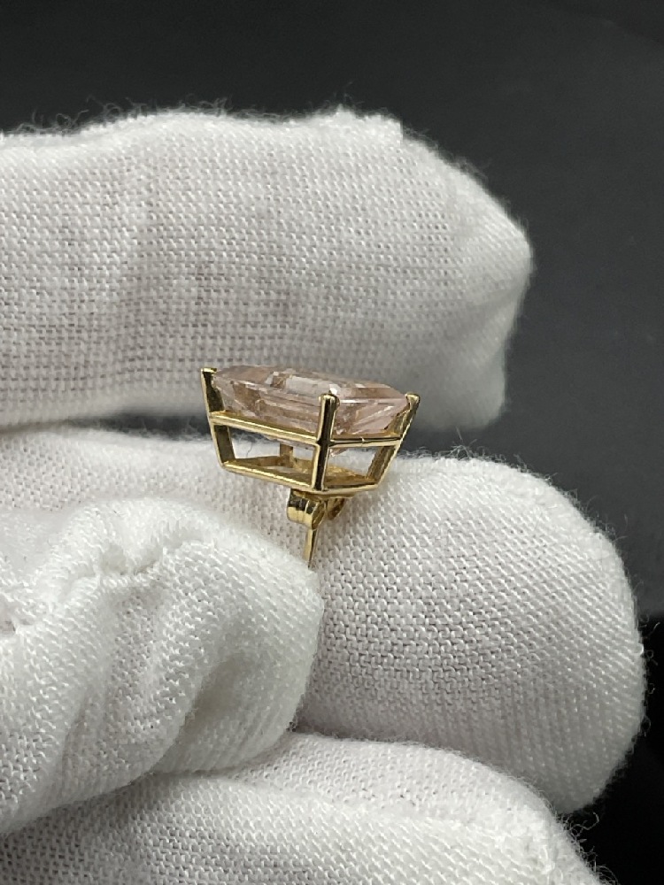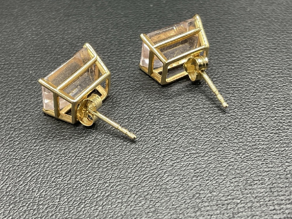 14K Yellow Gold Pink Sapphire Emerald Cut Earrings.