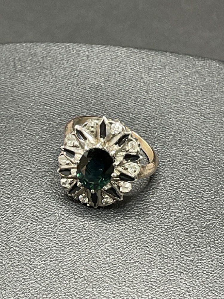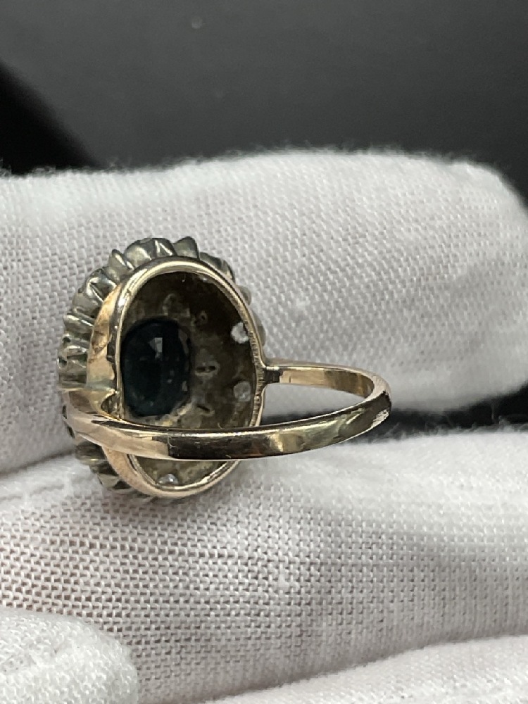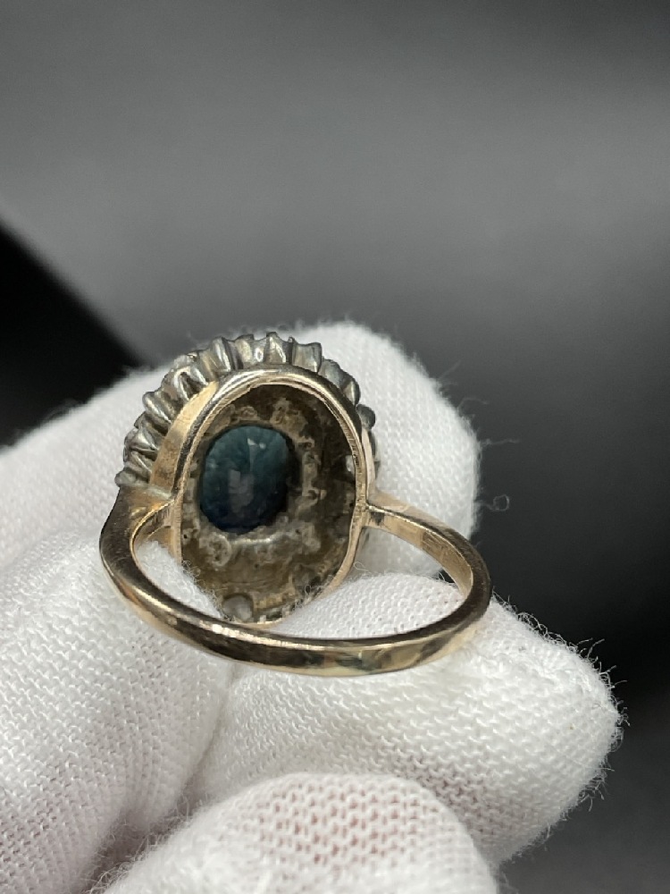 14K White and Yellow Gold Ring with Blue Sapphire and Diamond Stone. Accent enamel work within border.