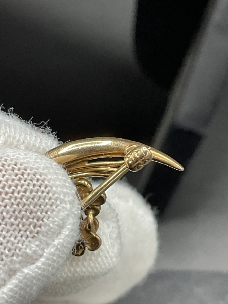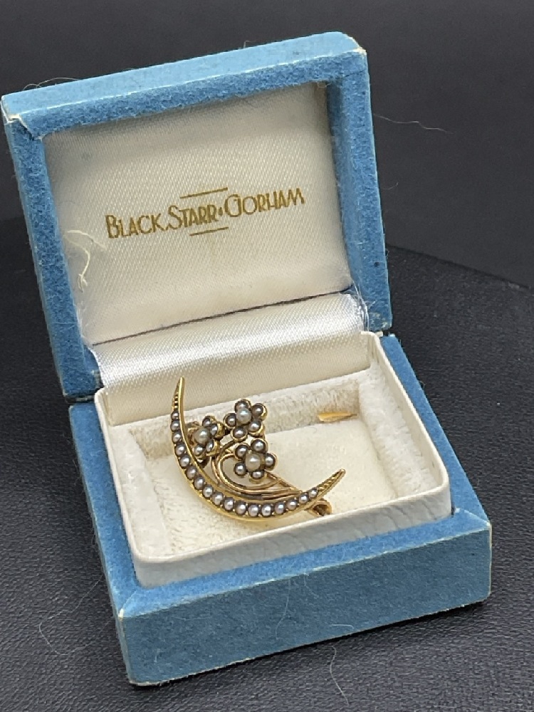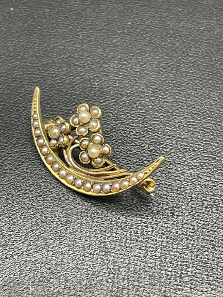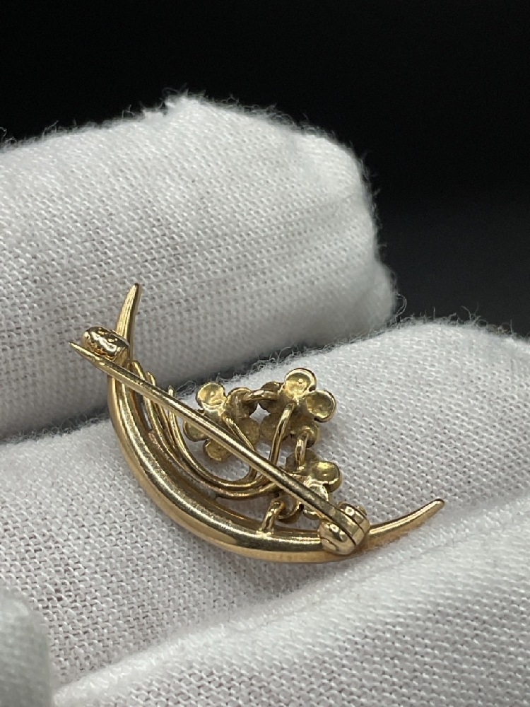 14K Yellow Gold Crescent Moon Floral Pin with Seed Pearls.