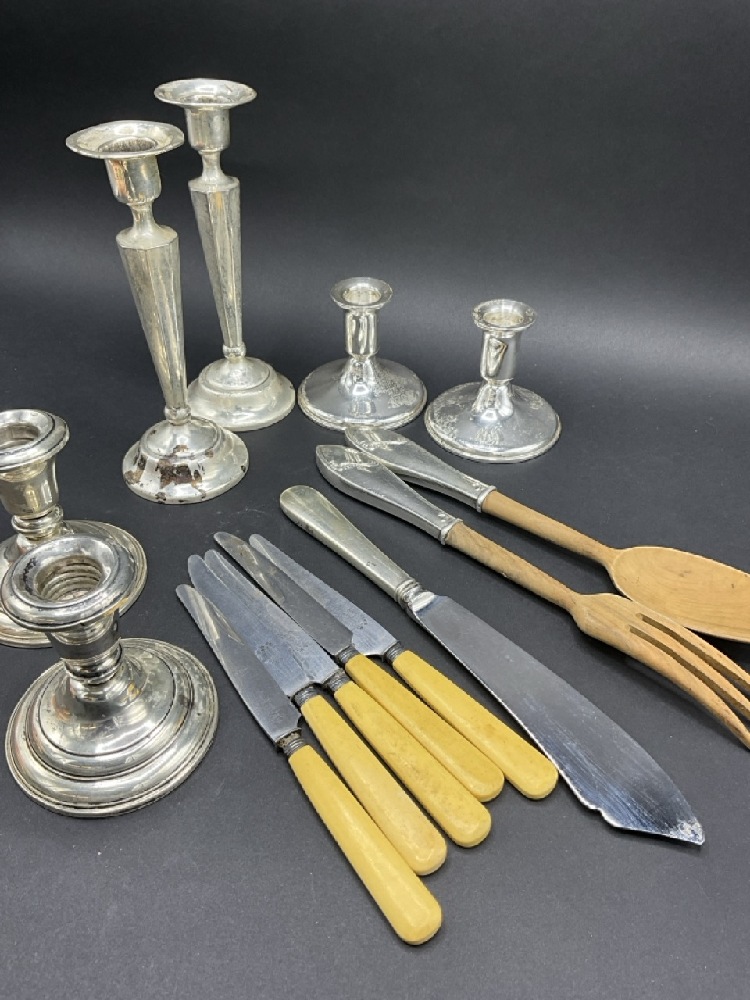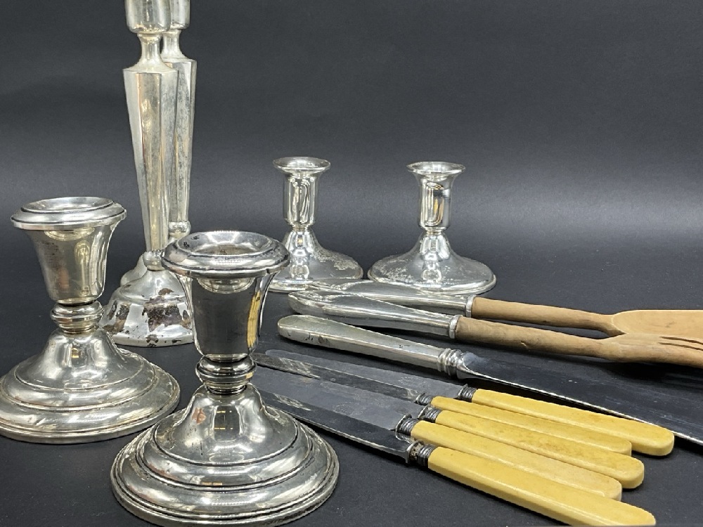 Compiled Sterling Silver Table Wares. Including Sterling handled serving pieces and six weighted candlesticks.