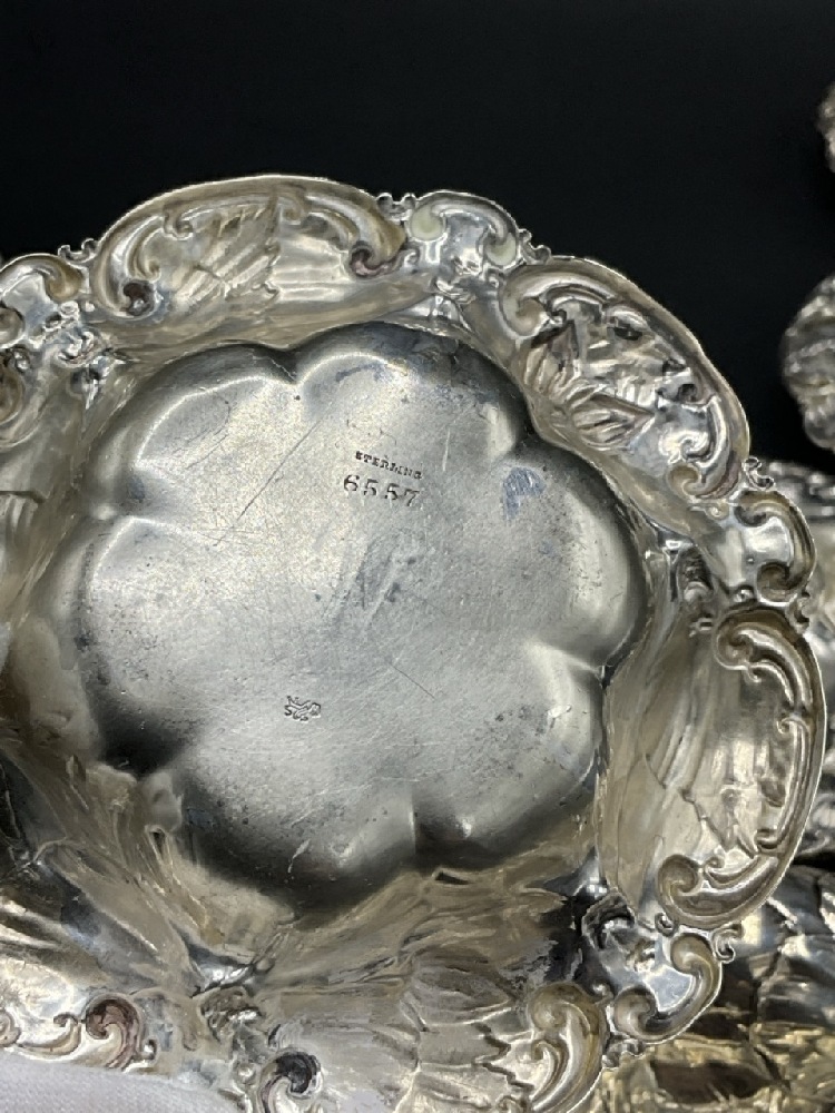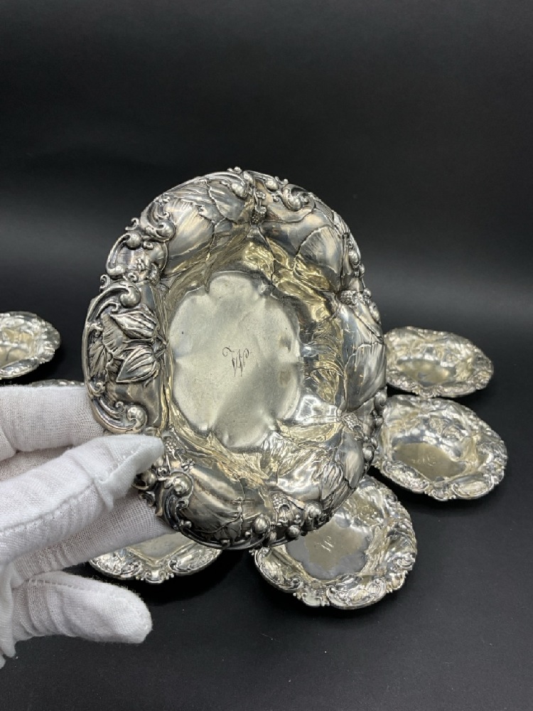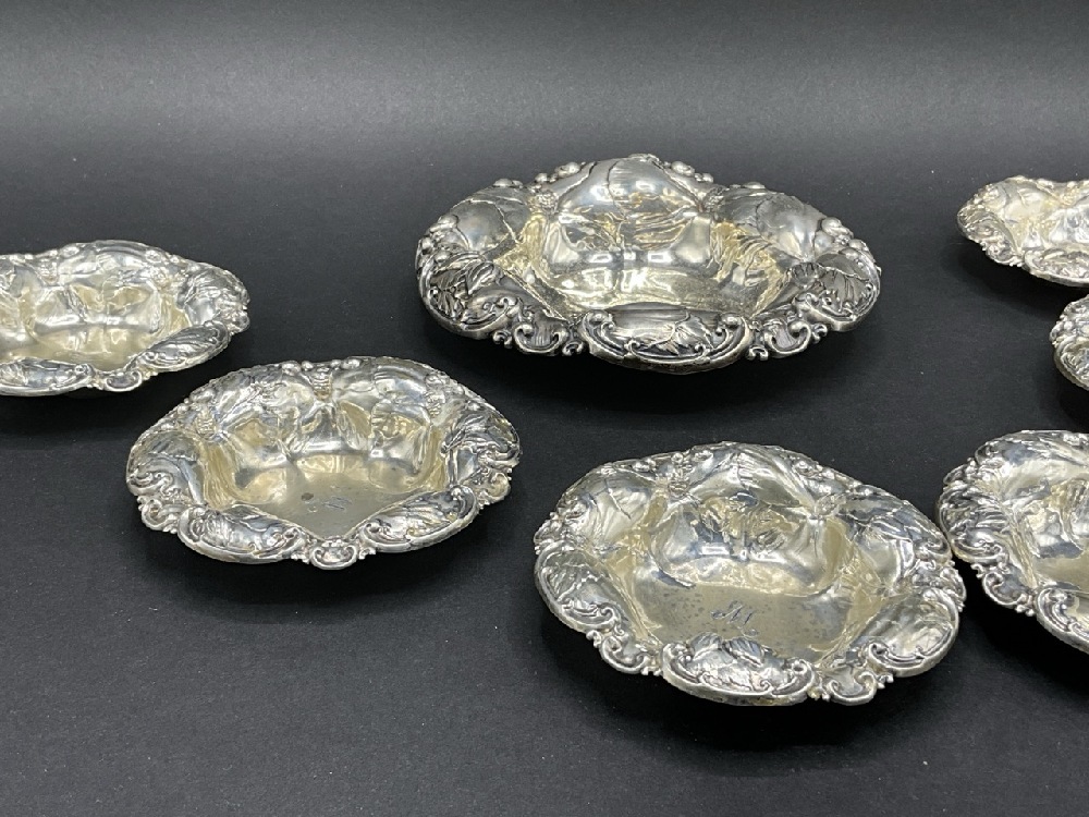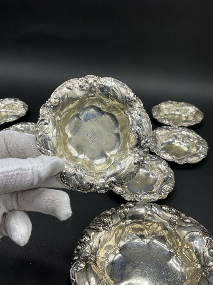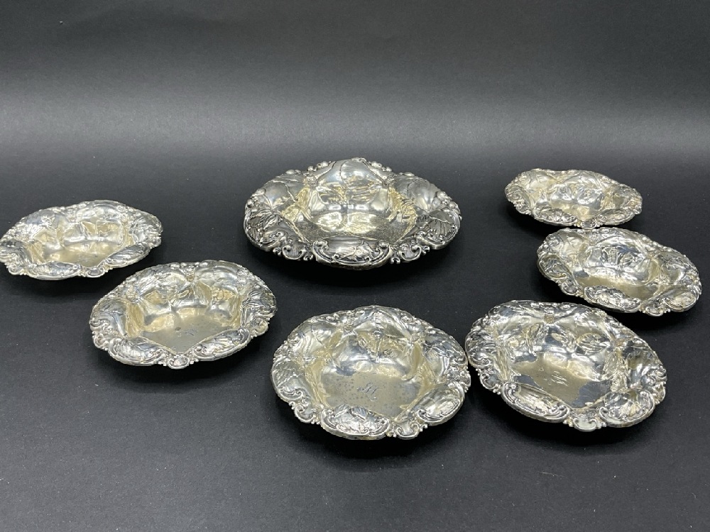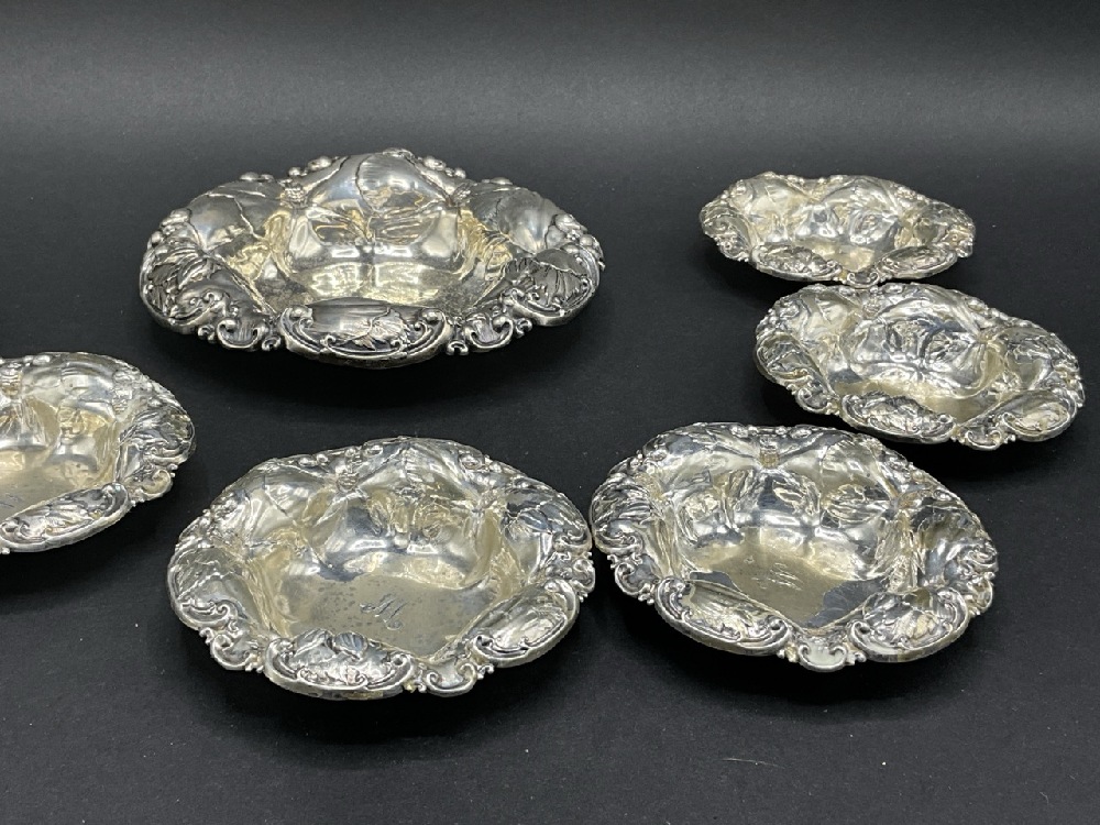 Seven (7) Whiting Sterling Silver Hibiscus Repousse Bowls. One master bowl and six individual size bowls.