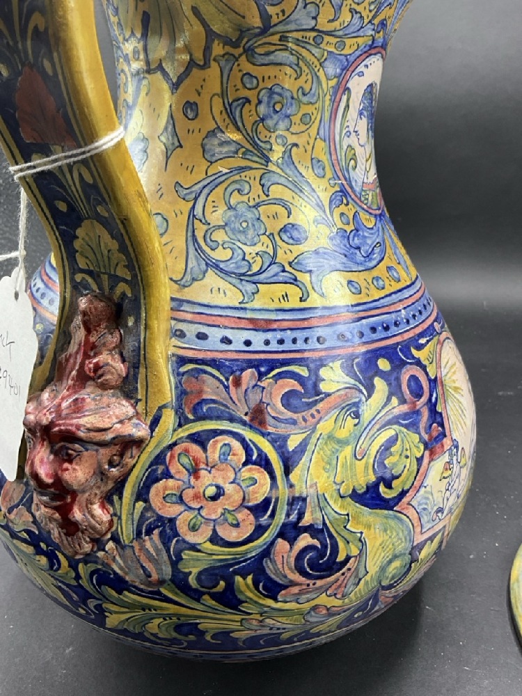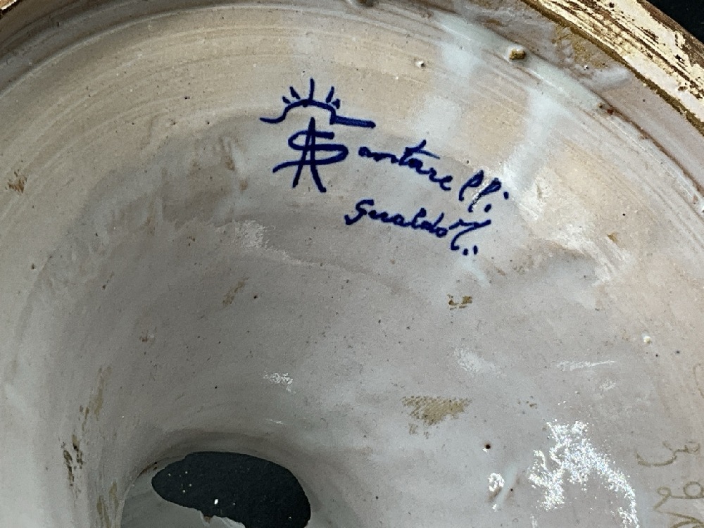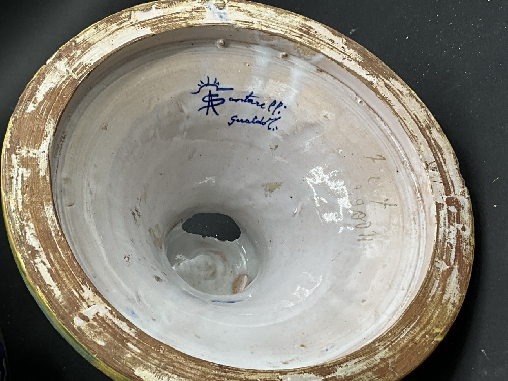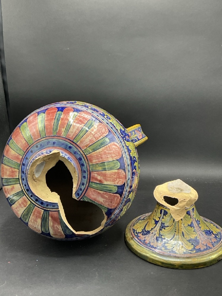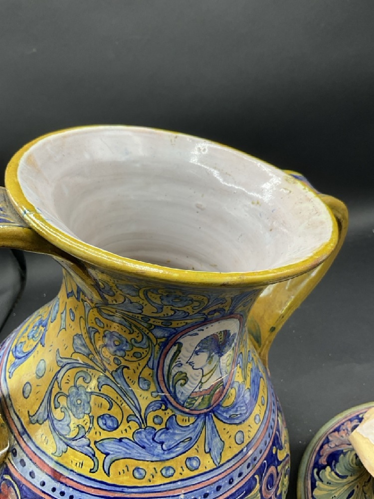 Large signed Damaged do Santerelli Majolica Luster Double Handled Urn. From the